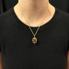 Superb vintage 18k yellow gold lantern charm. Features miniature rosettes and three marquise cut red glass stones.