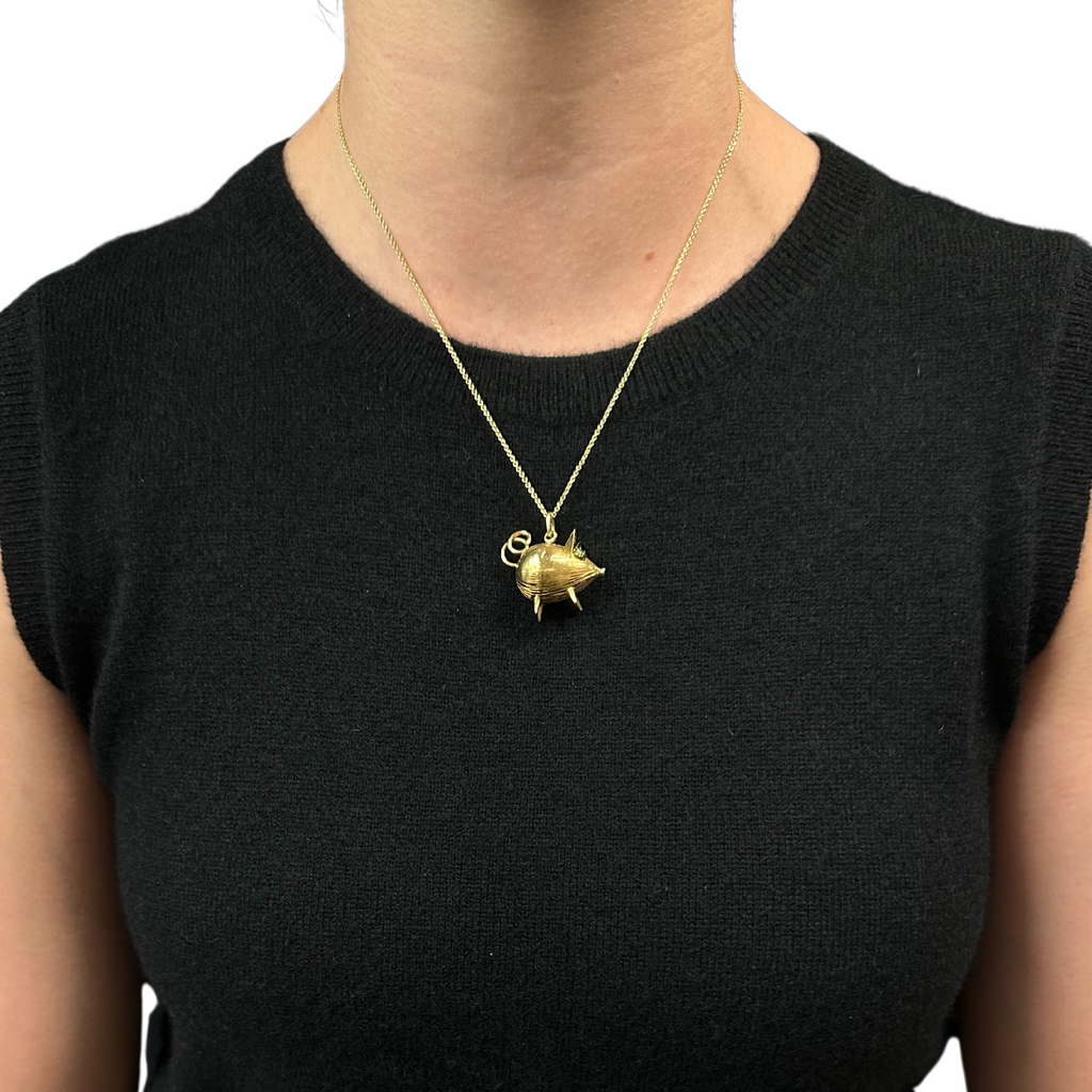 Delightful vintage textured 18k yellow gold pig charm. Features a platinum nose and turquoise colored glass eyes.