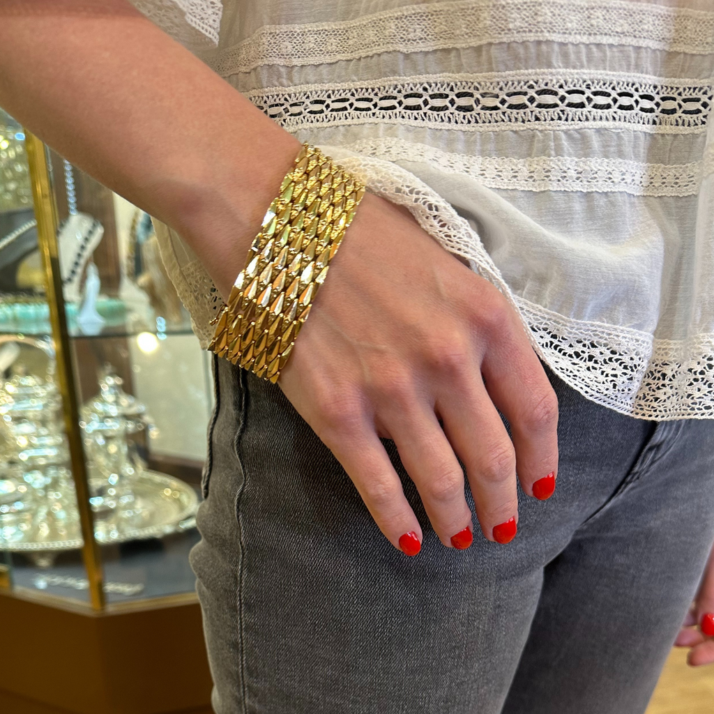 Lovely Italian 18k high polish rose gold lozenge-shaped link cuff bracelet featuring a floral motif on the ends of the links. This bracelet attaches with a push clasp and has one figure eight safety lock.