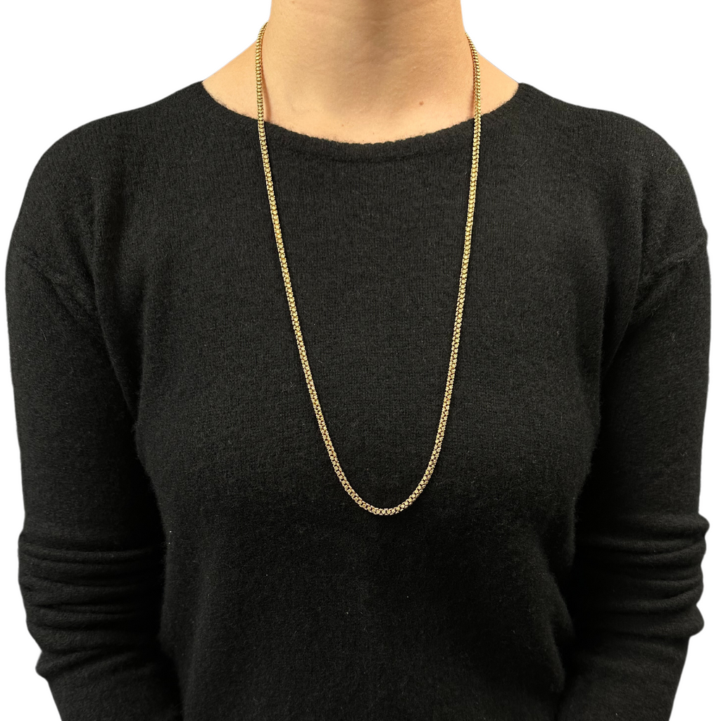 Exceptional 18k rose gold flexible rosette link necklace measuring 30 inches in length. The push clasp is beautifully decorated with matching rosettes and has two figure eight safety locks.