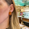 Lovely pair of large statement oval cabochon cut rich cognac colored amber stones framed in buttery 14k yellow gold frames.