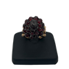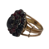 This ring features an antique garnet cluster gallery set in silver, on a vintage 18k rose gold tri-split shank with U-guard on band interior for sizing.