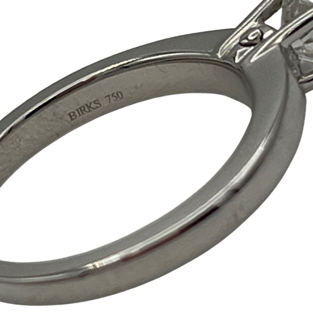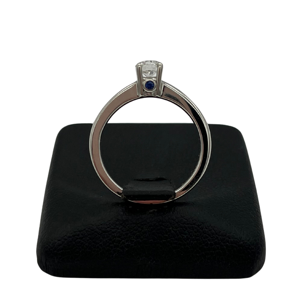 Vintage Birks 0.34ct solitaire diamond ring in 18k white gold with a small bezel set sapphire detail.