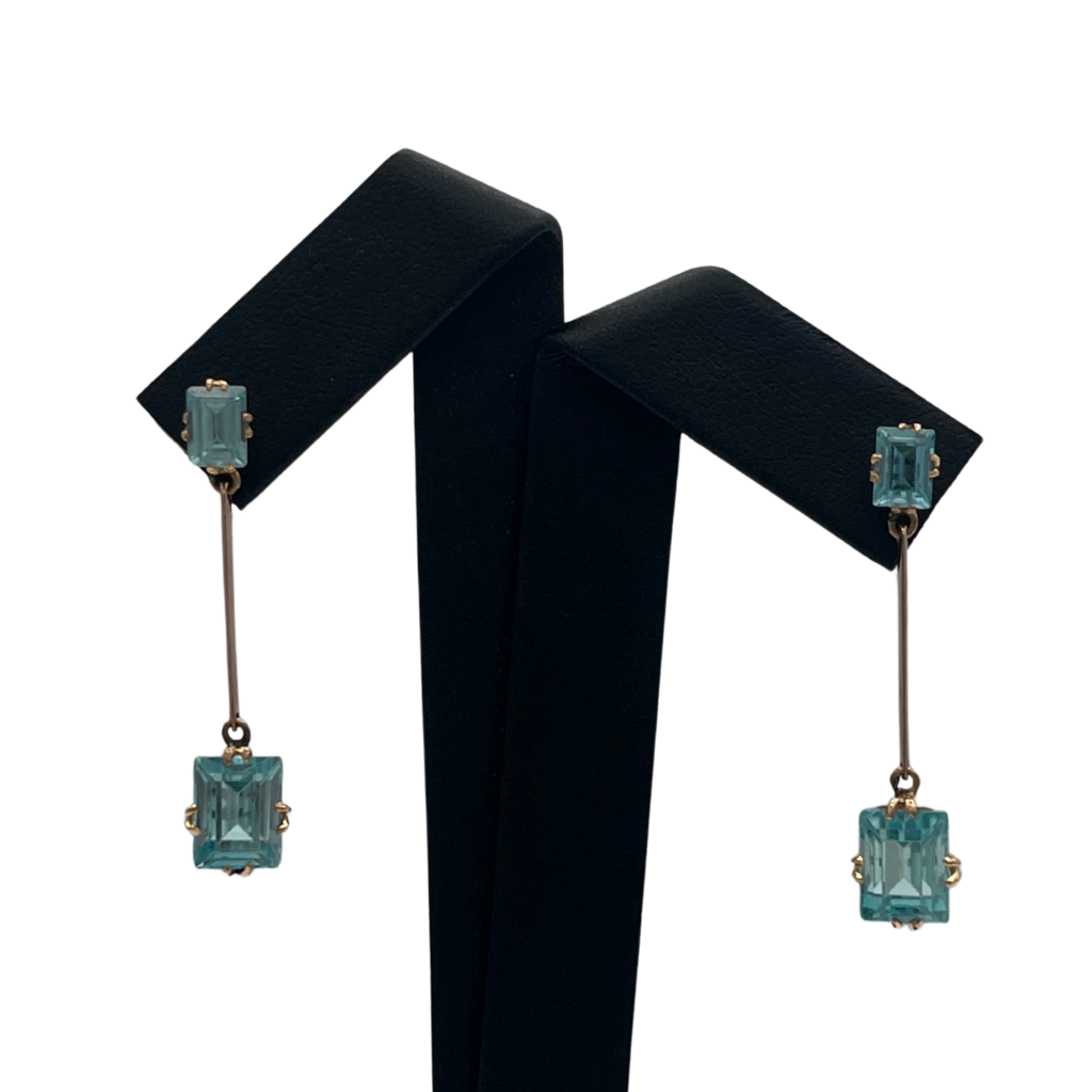 Vintage blue zircon and 14k rose gold drop earrings dating to the 1930's. The earrings feature a smaller stone at the post and a larger stone at the bottom which are connected by a thin rose gold bar. Earrings are worn with a post and butterfly back.