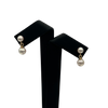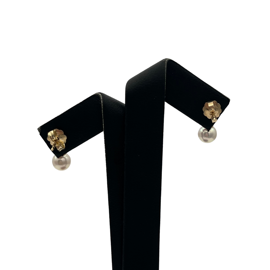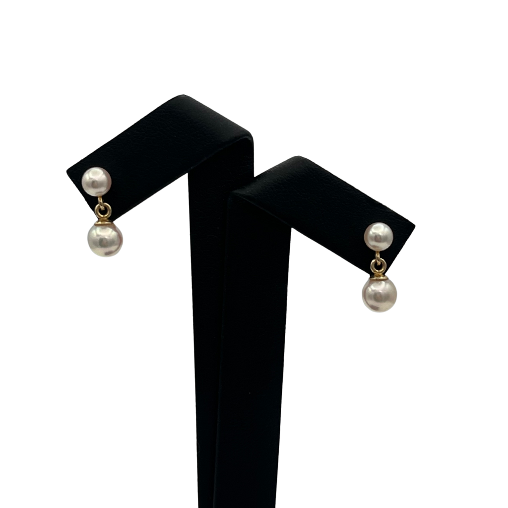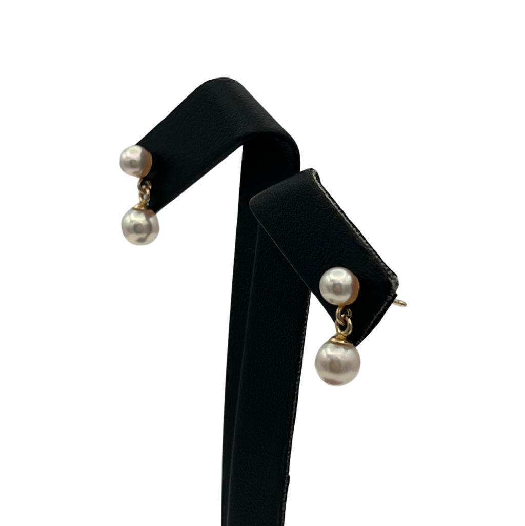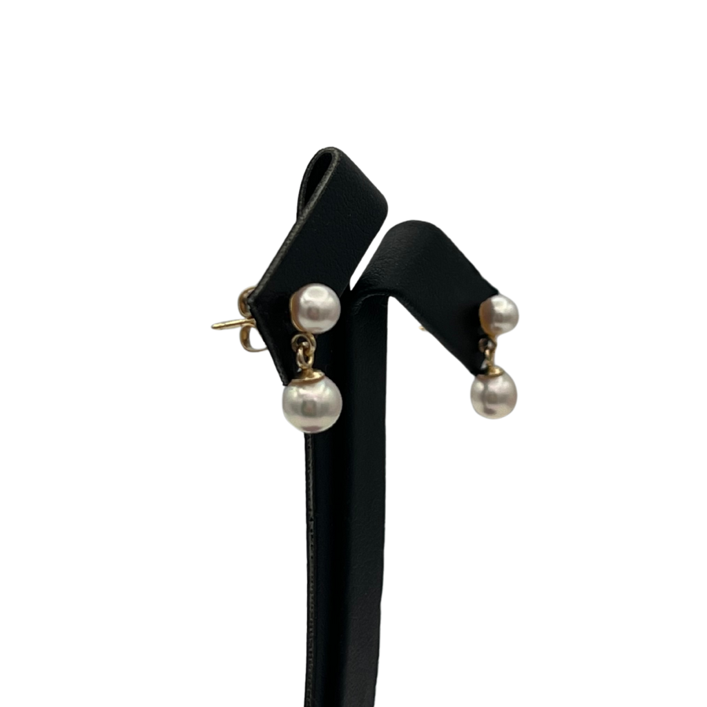Vintage double cultured pearl drop earrings in 14k yellow gold. Earrings are worn with a post and butterfly back.