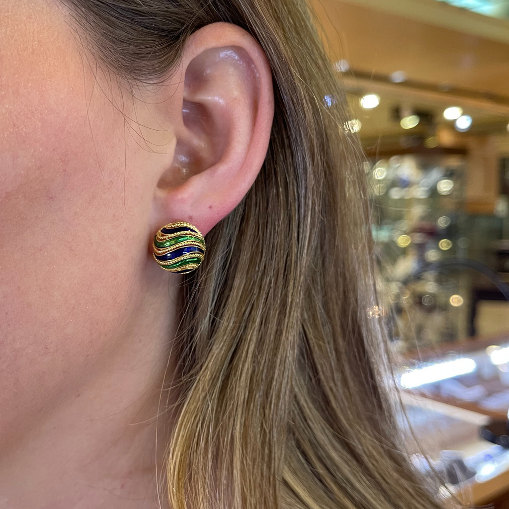 Elegant pair of 18k yellow gold round domed clip-on earrings decorated with vibrant blue and green enamel work. Earrings feature twisted cable and openwork.