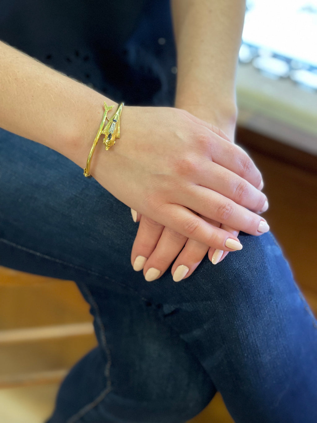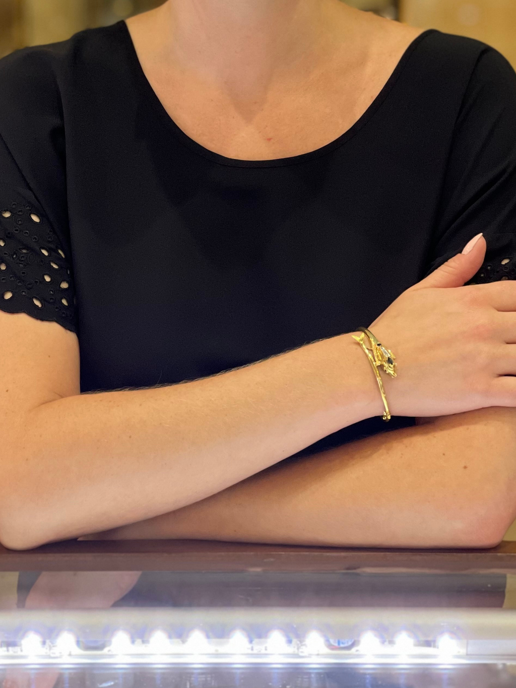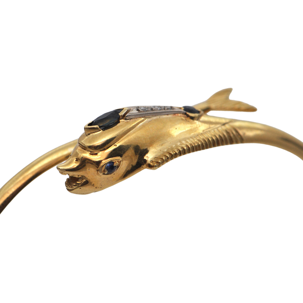 Considered one of the most intelligent marine mammals this feisty 14k yellow gold dolphin certainly makes a splash. The head is wonderfully detailed and is adorned with sapphires and diamonds.