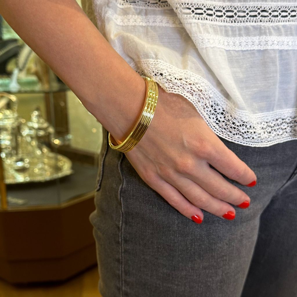 Lovely Italian ridged oval 14k yellow gold bangle bracelet.