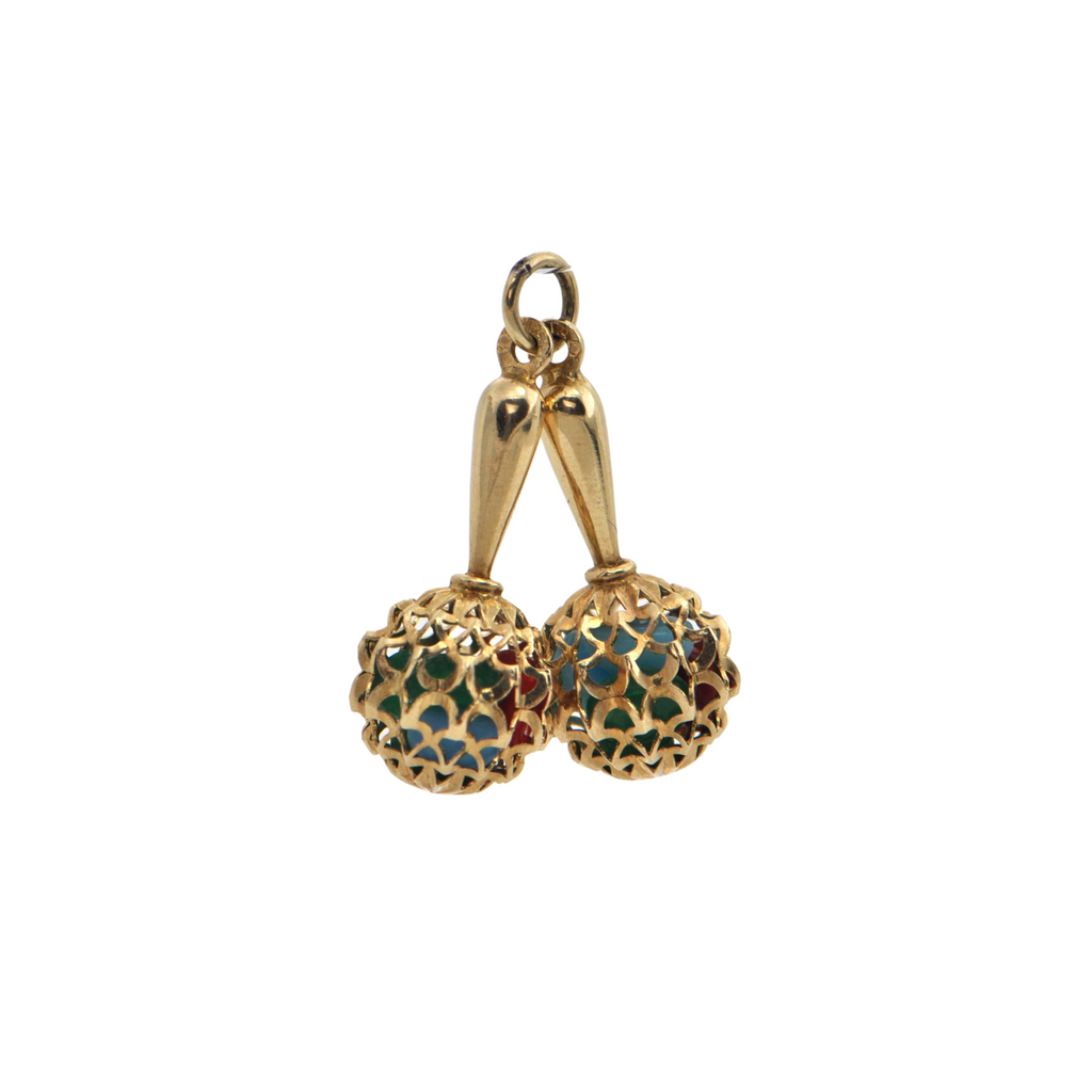 Get your groove on with these miniature 14k yellow gold maracas charm filled with colorful glass beads. Charm hails from Italy circa the 1950's.