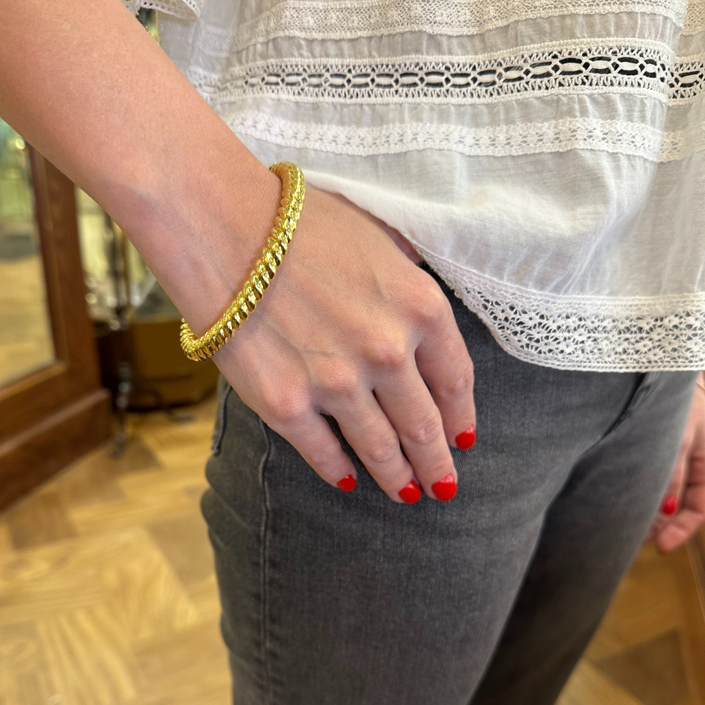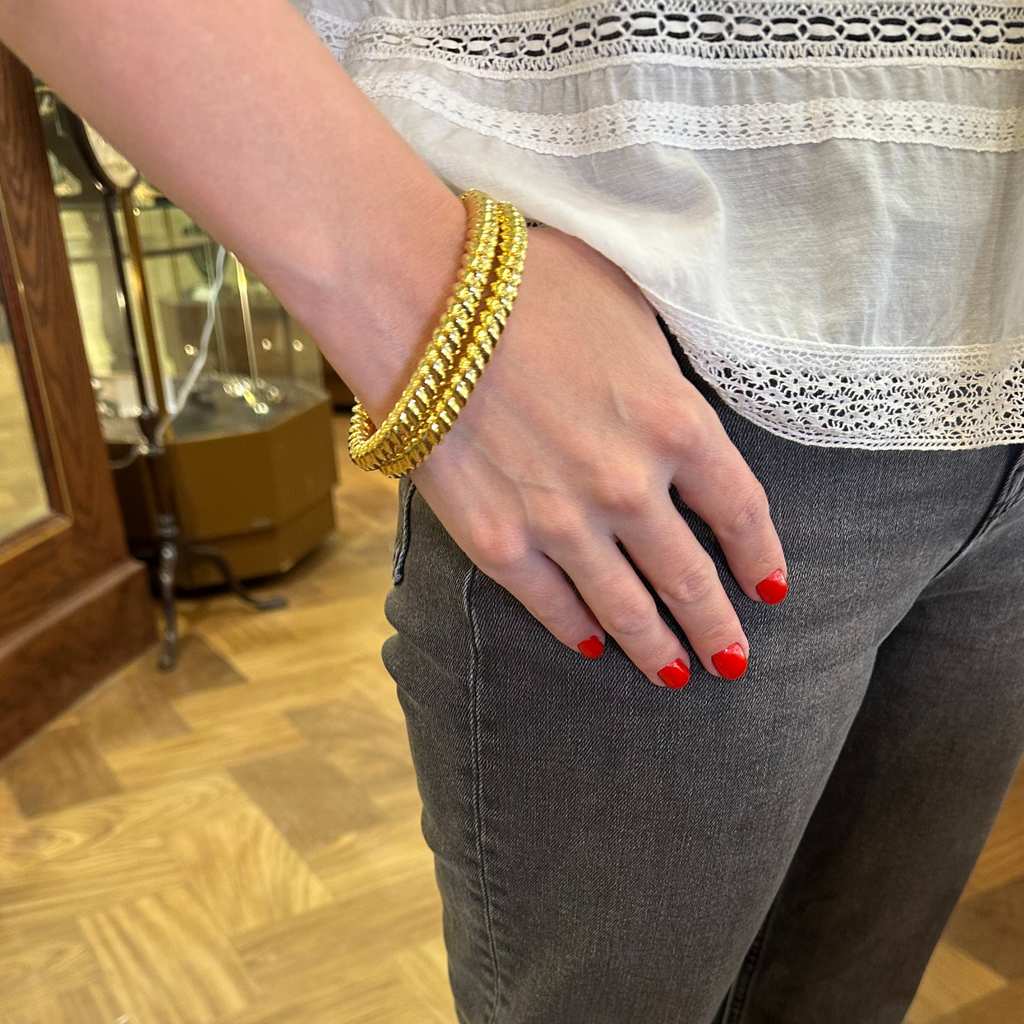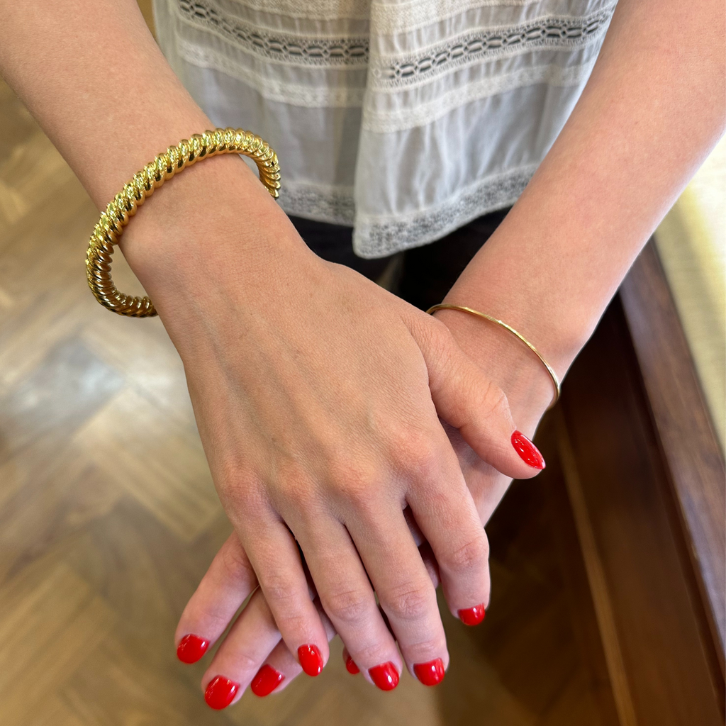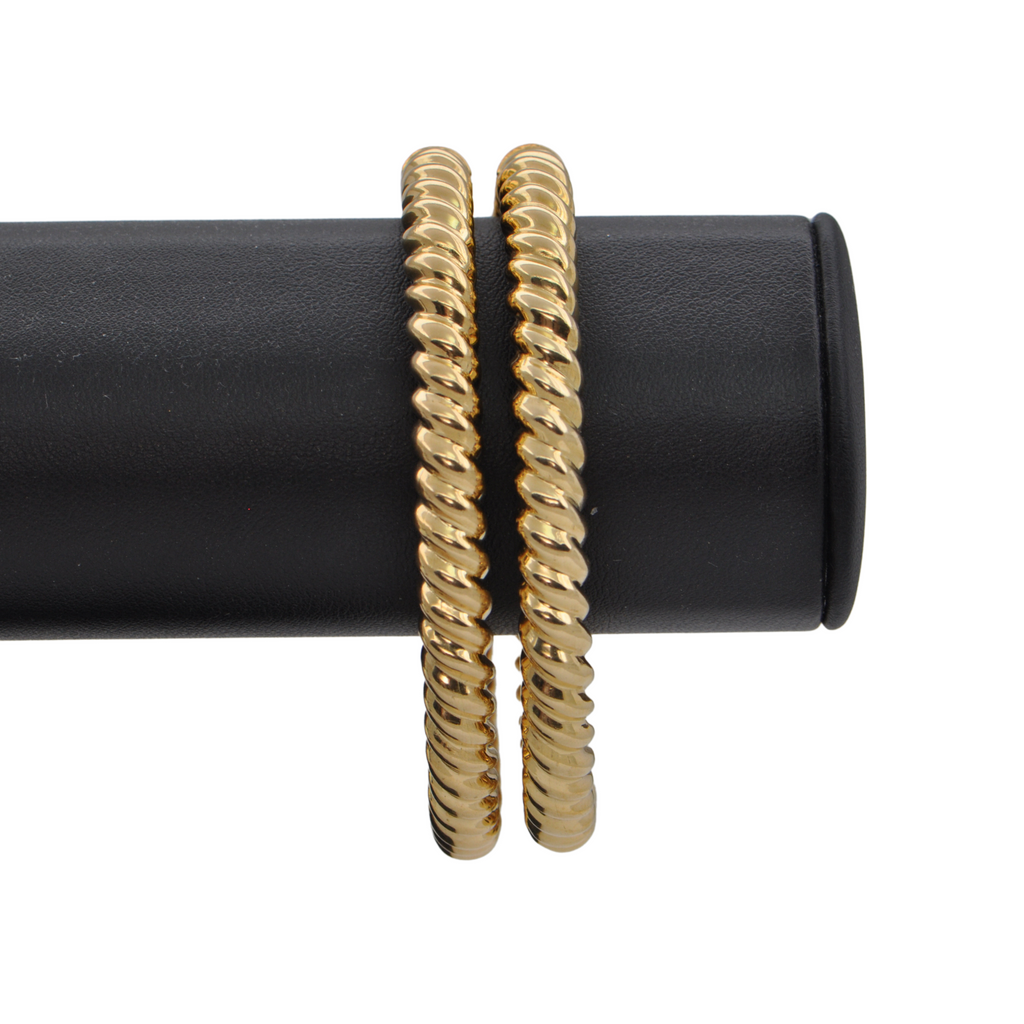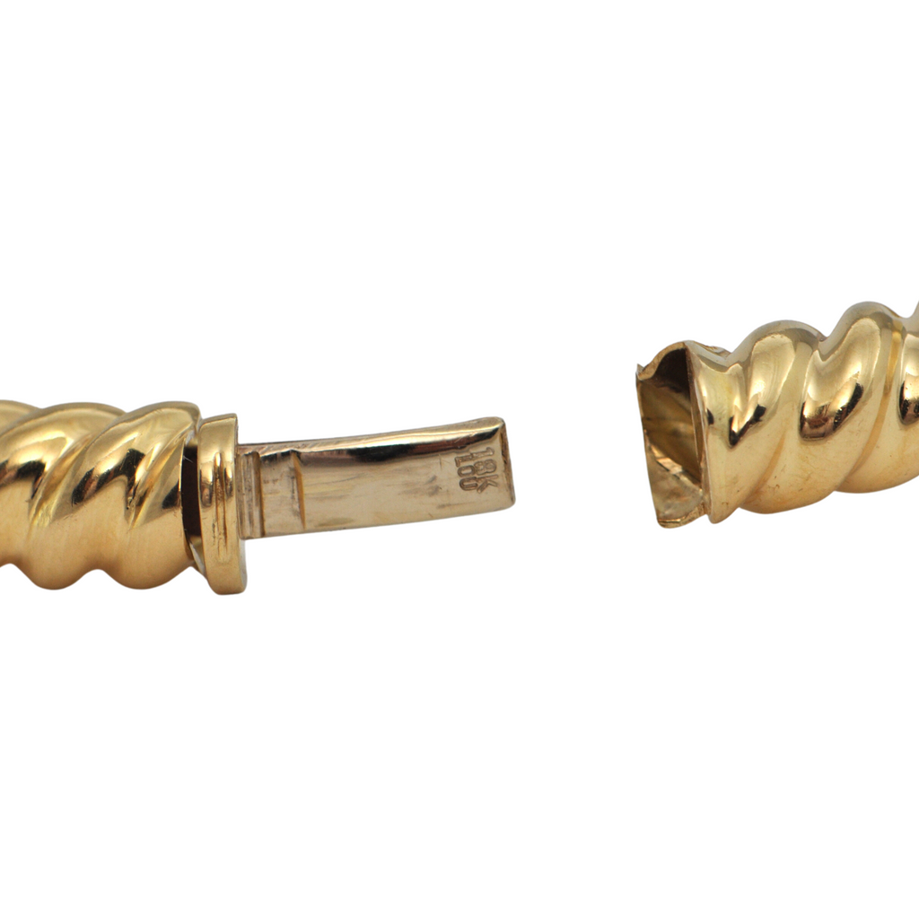 Sleek and stylish 18k yellow gold twisted oval hinged bangle bracelet. There are two available.