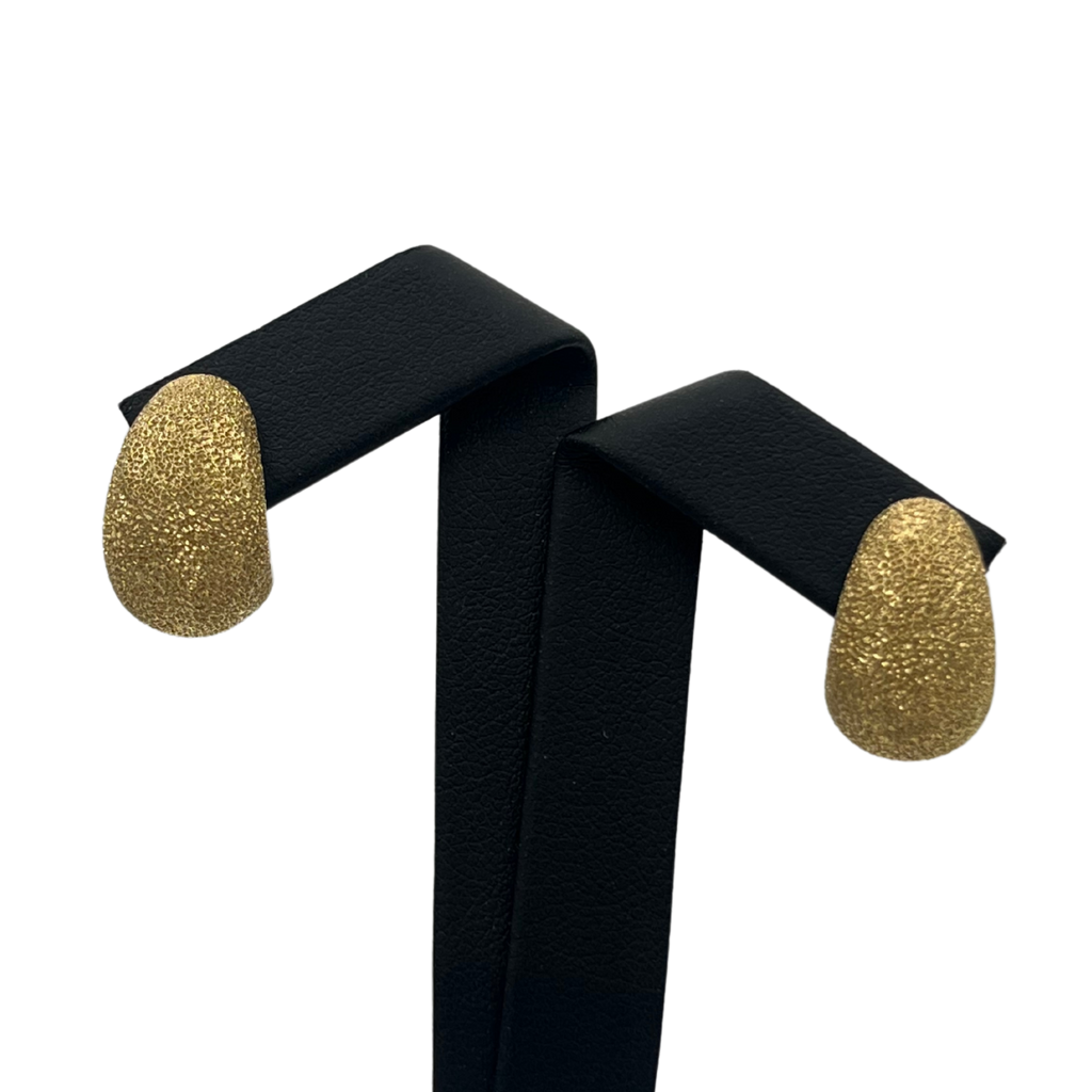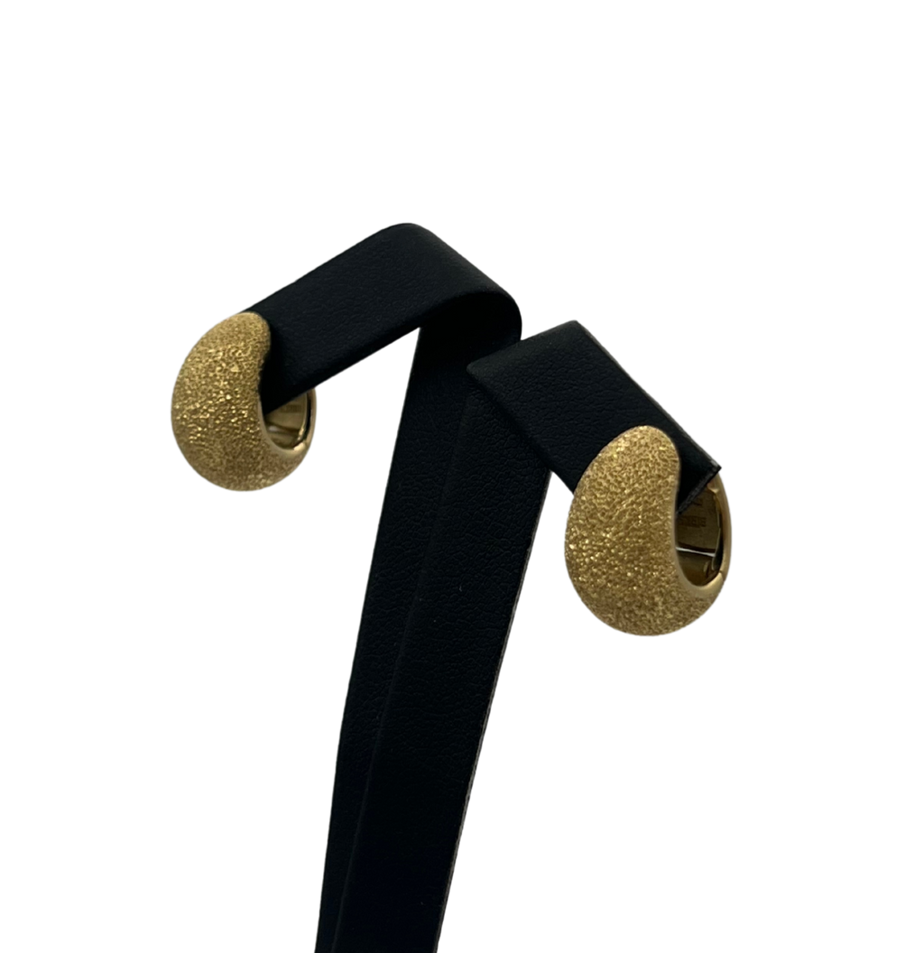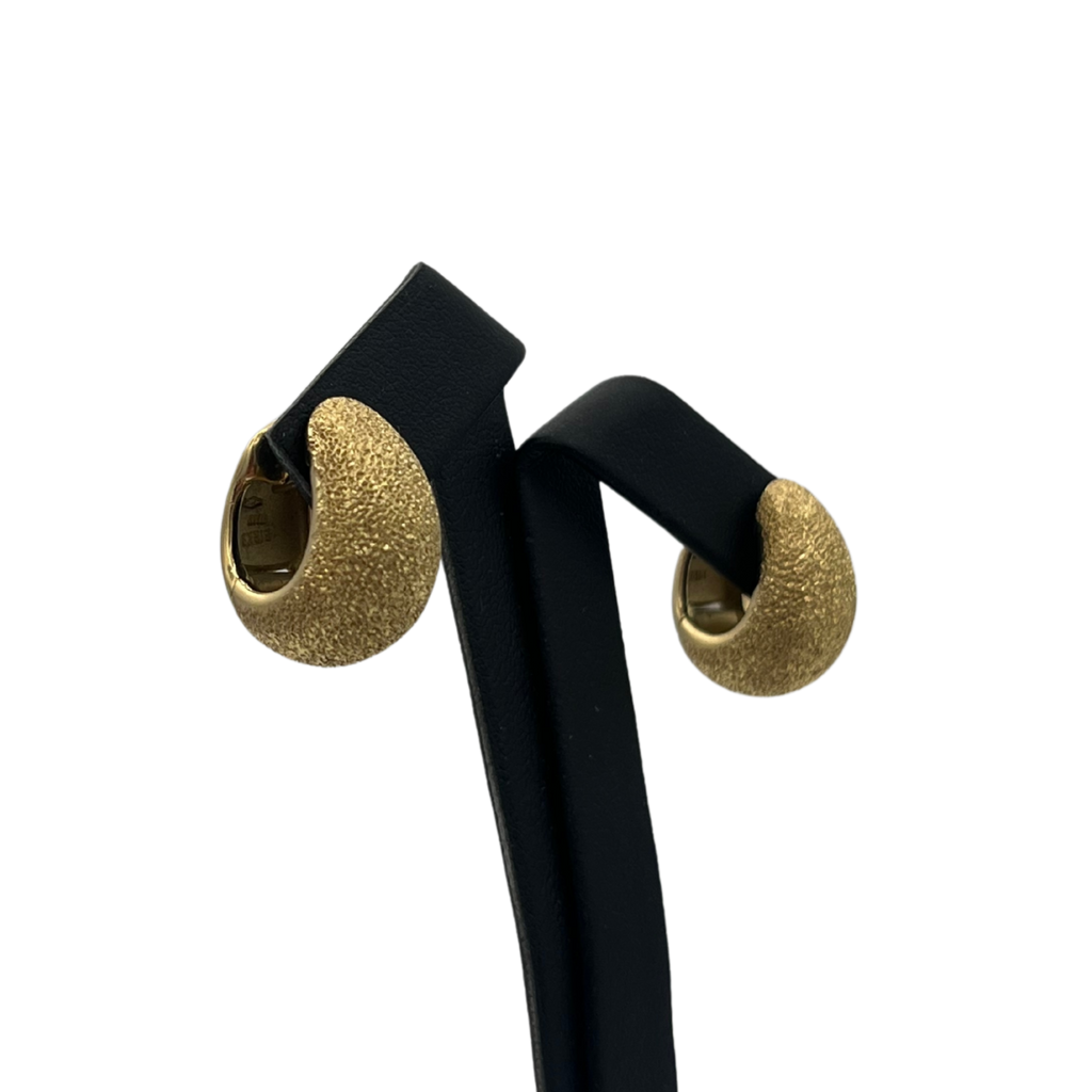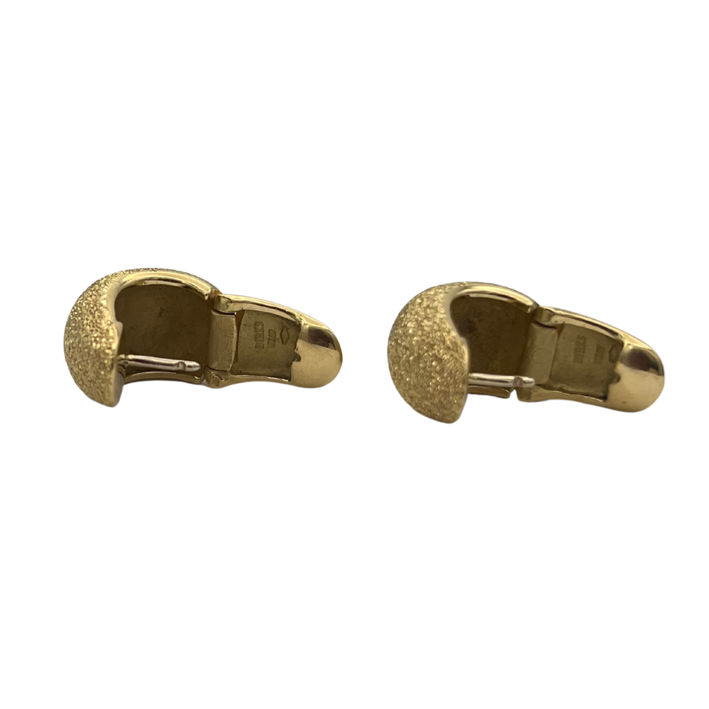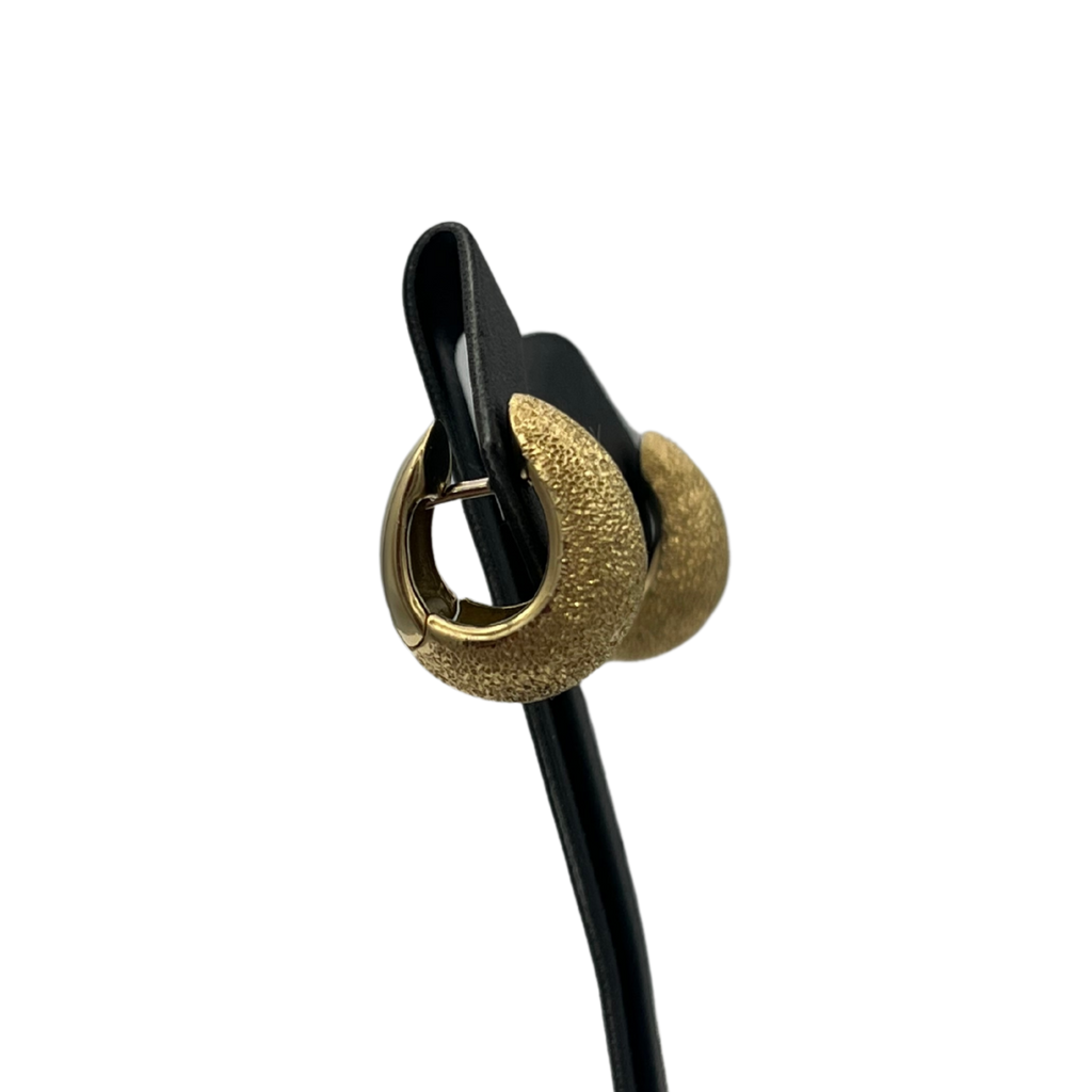 A fantastic pair of 18k yellow gold huggie earrings sure to dazzle. The deep sandblast finish on these earrings sends light reflecting in all directions.