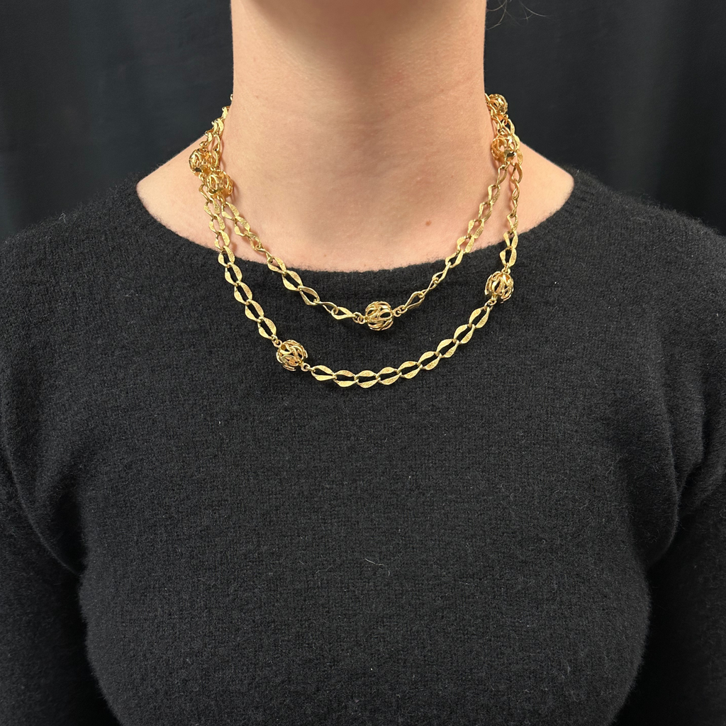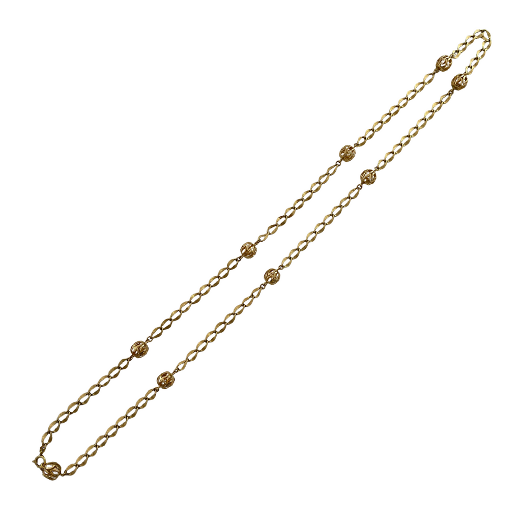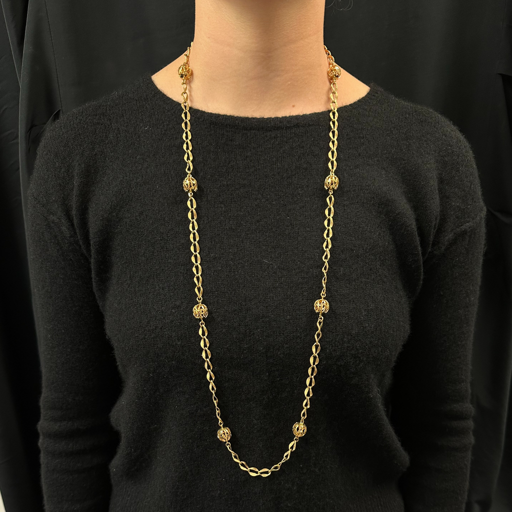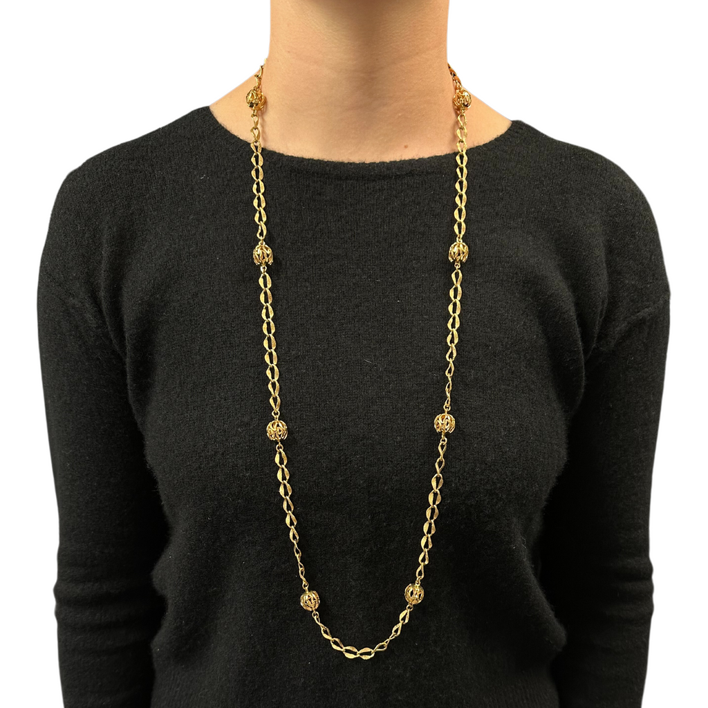 Chic vintage Italian 18k yellow gold necklace with flat oval links featuring glass blast finish and high polish gold ball stations. Necklace measures 36 3/4 inches in length and attaches with a spring ring.