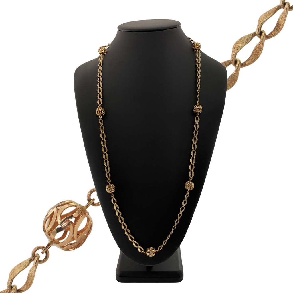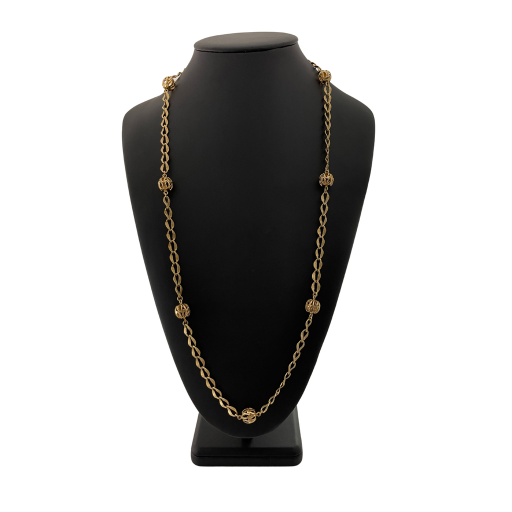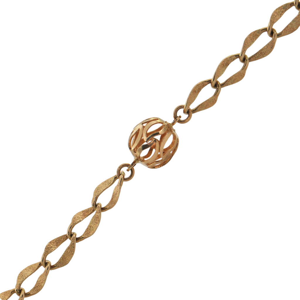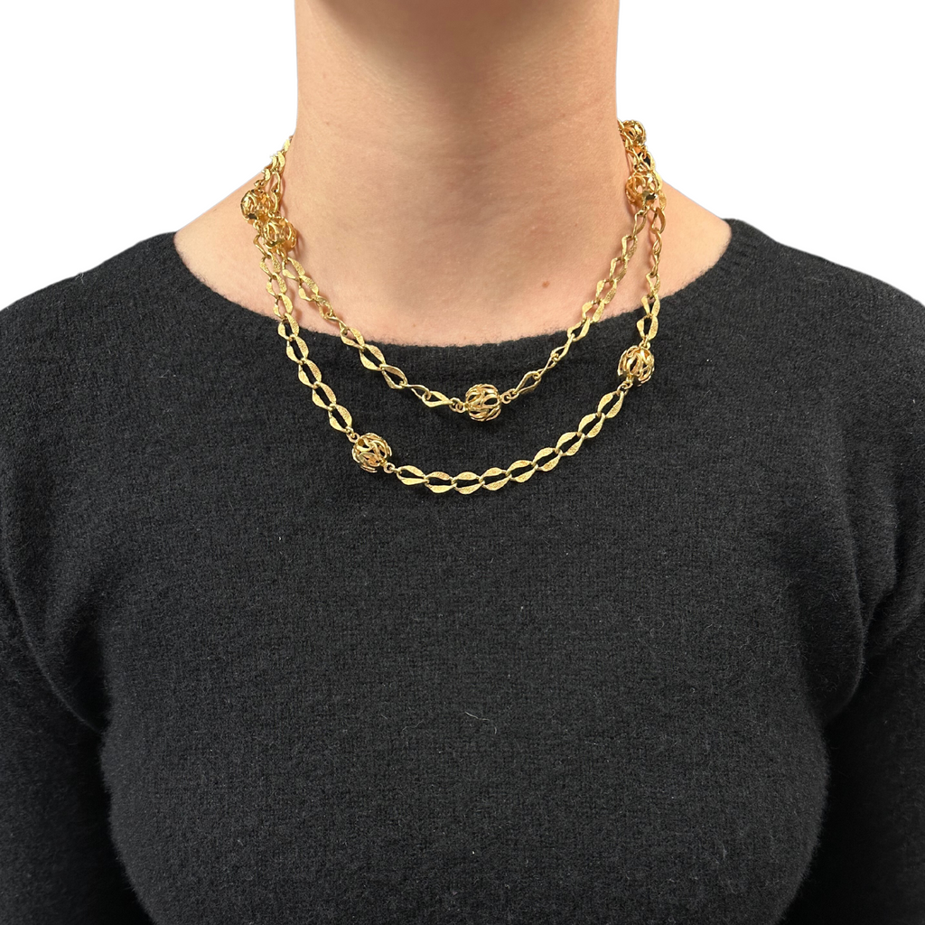 Chic vintage Italian 18k yellow gold necklace with flat oval links featuring glass blast finish and high polish gold ball stations. Necklace measures 36 3/4 inches in length and attaches with a spring ring.