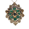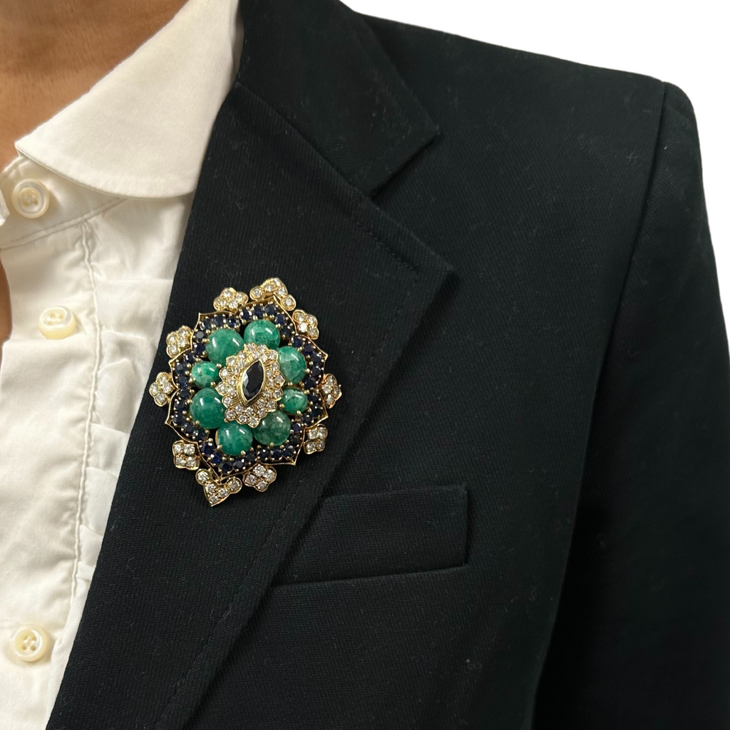 This is simply a show-stopping retro pendant. Set in 18k yellow gold the center marquise cut sapphire is surrounded by a halo a sparling diamonds, emeralds, sapphires, and even more diamonds! With a hidden bail this pendant can also be worn as a brooch.