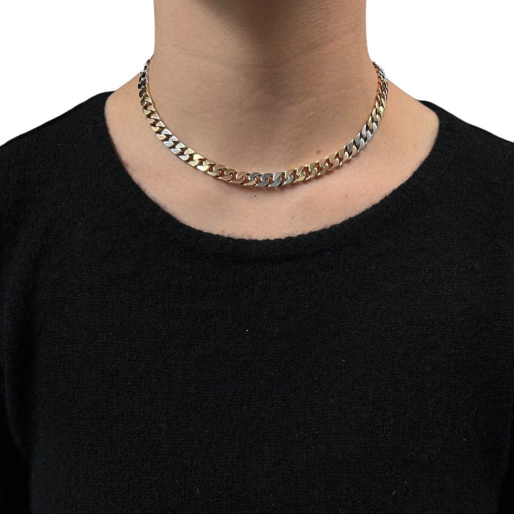 Super versatile vintage solid 18k three-toned flat curb link necklace. Features a high polish finish, attaches with a push clasp and figure eight security clasp.