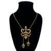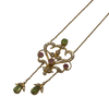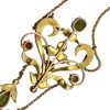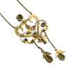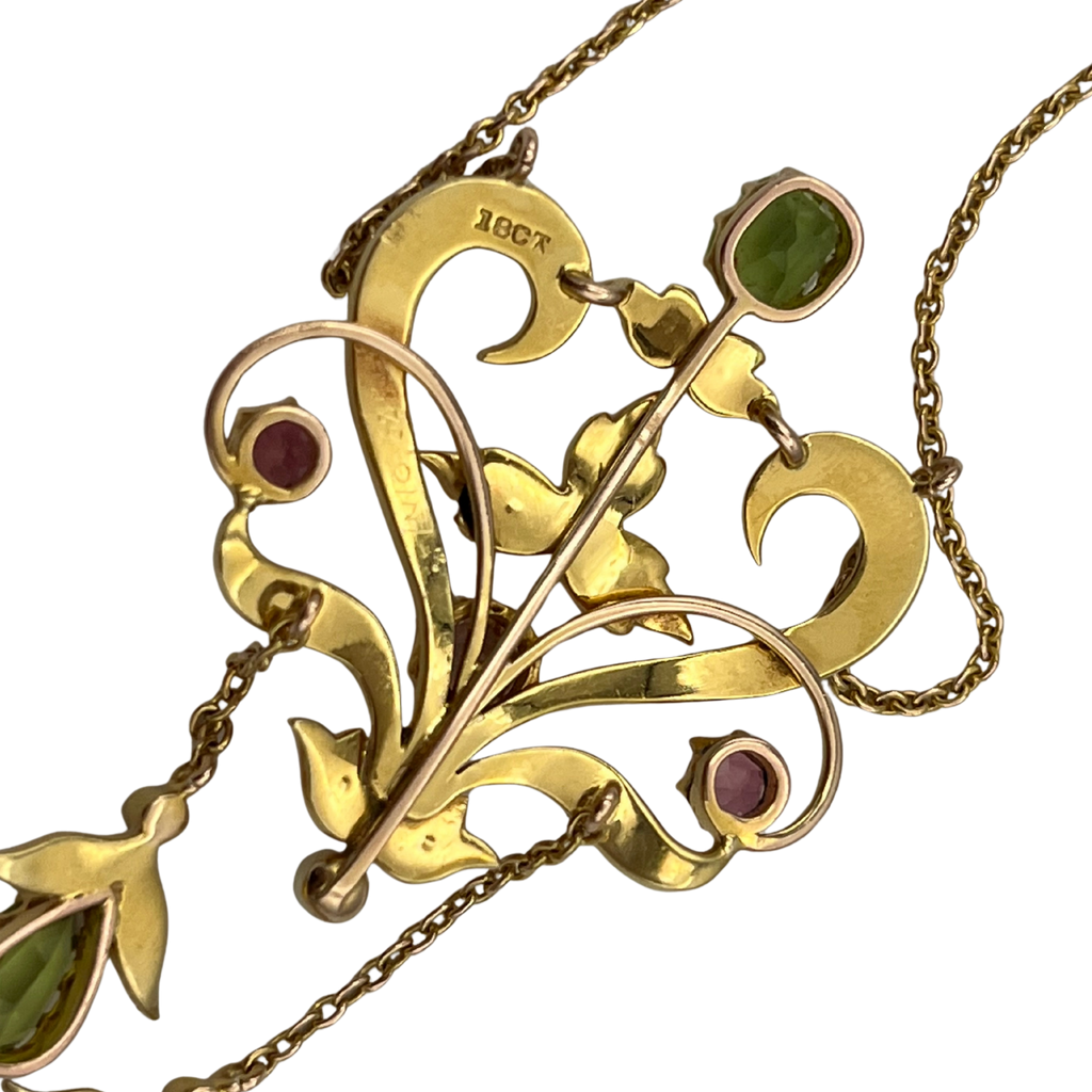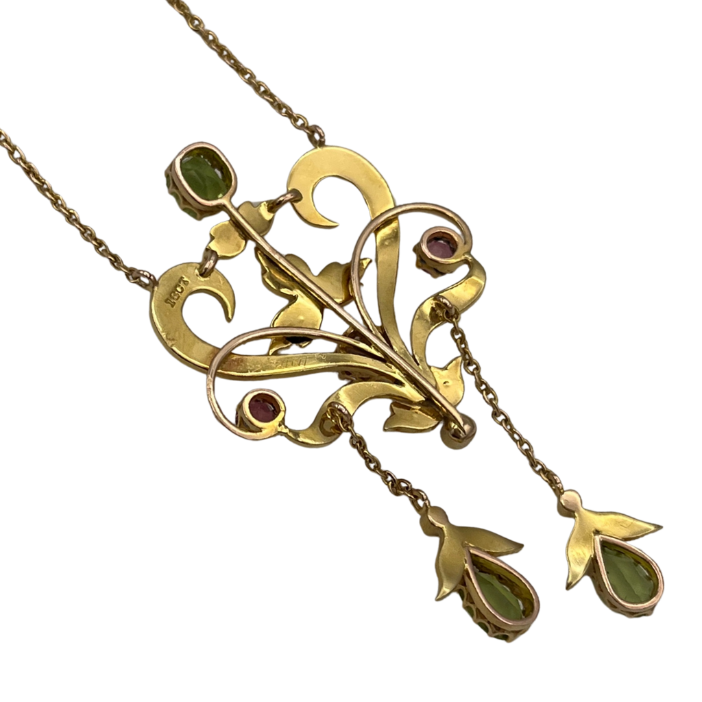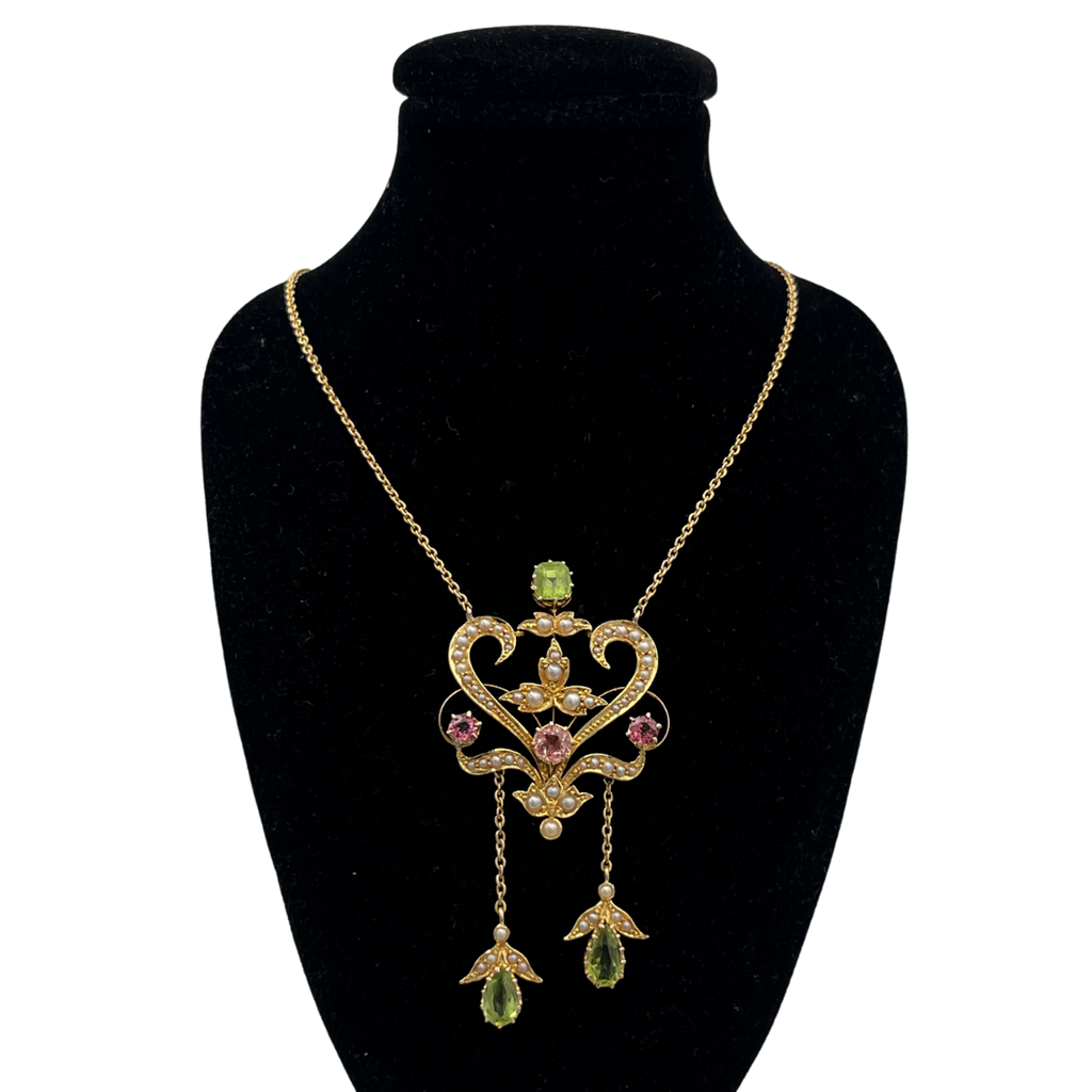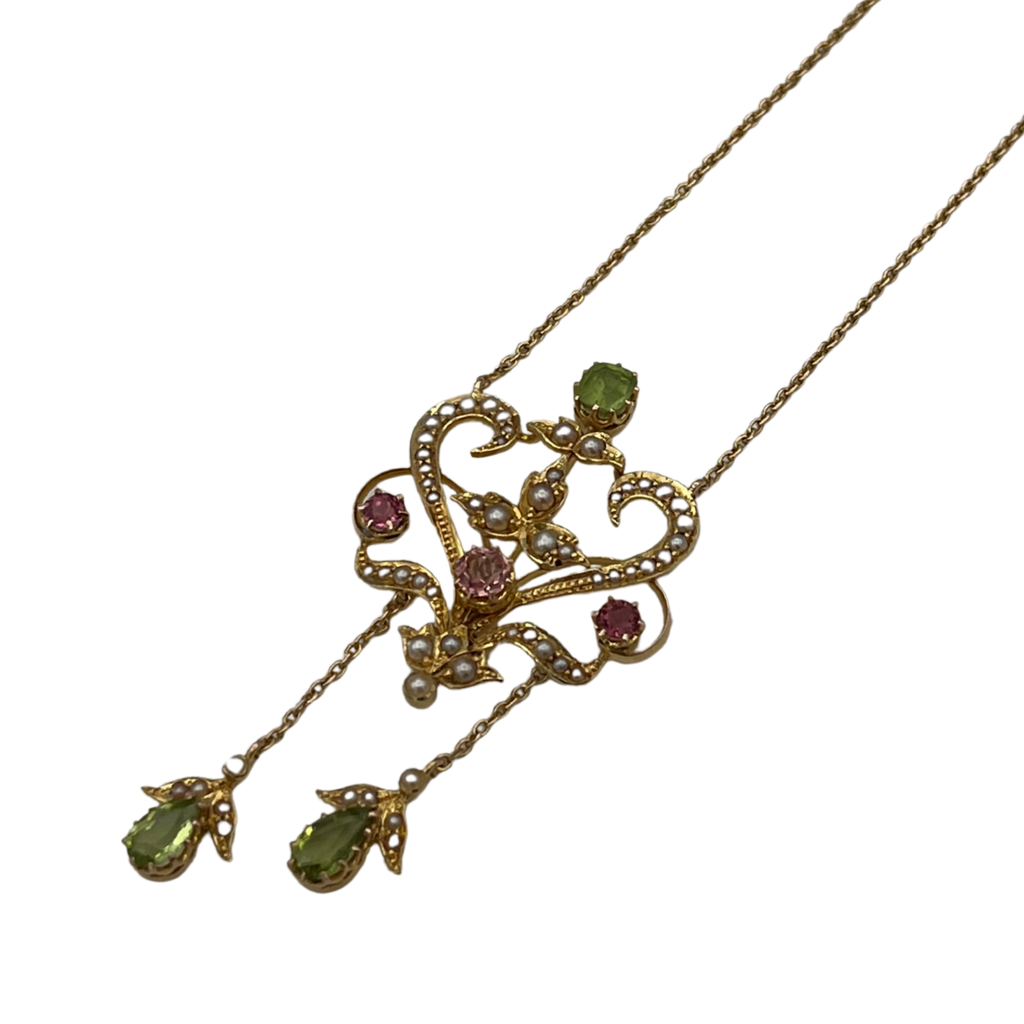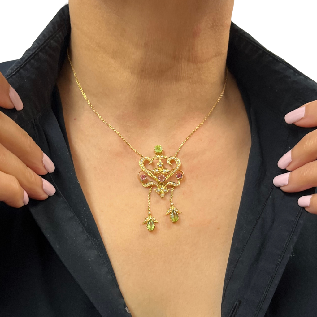 Beautiful antique lavalier necklace in 18k yellow gold featuring bright olive green peridot & pink-violet tourmaline stones, and seed pearls dating to the "Art Nouveau" period (circa 1890). The necklace is on a 1.34mm chain and has a 15k yellow gold push clasp.