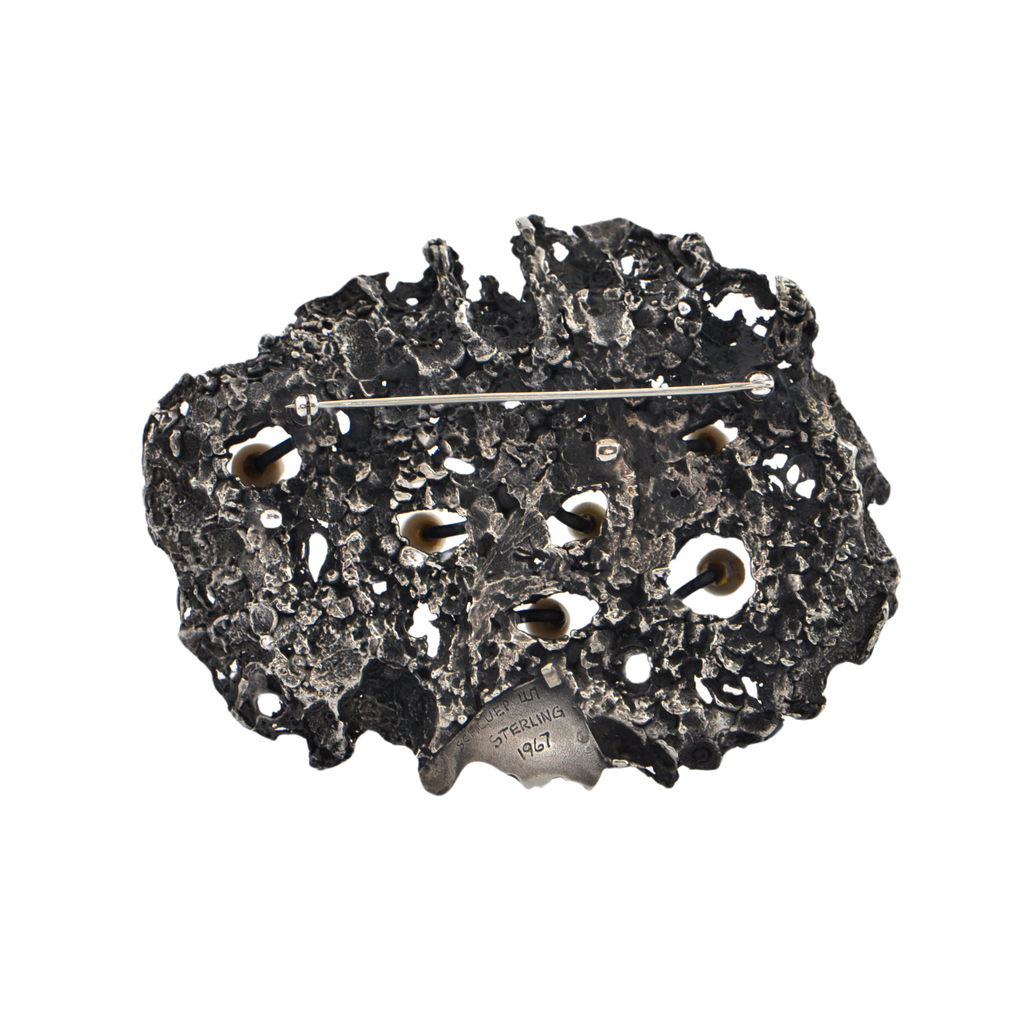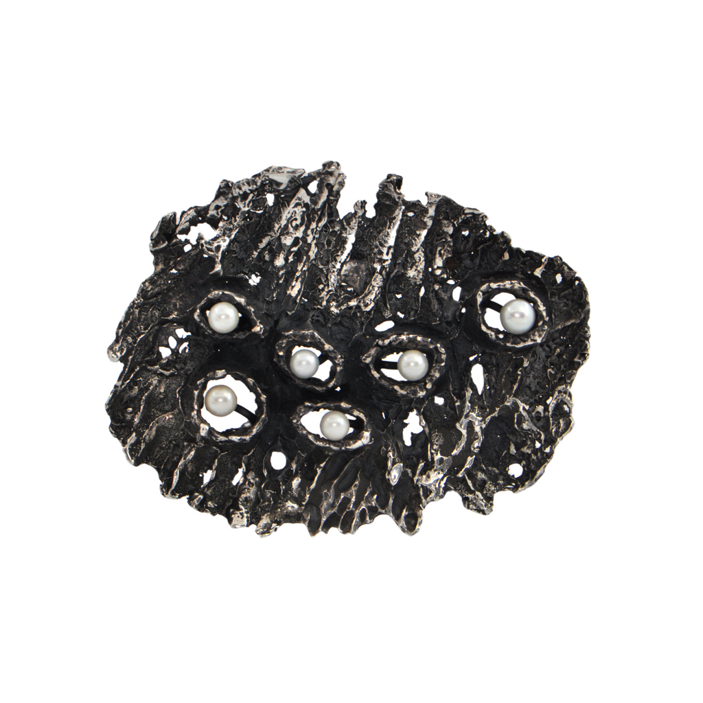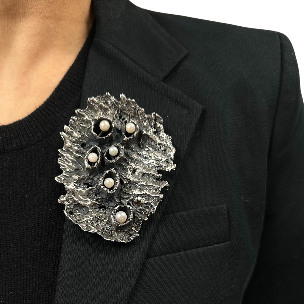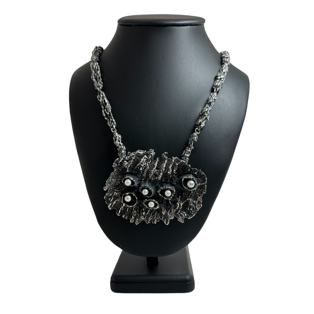 An exquisite example of Walter Schluep's artistry, this brutalist style brooch/pendant is adorned with lustrous pearls, and the perfect chain offers a fitting accompaniment to the brooch pin.