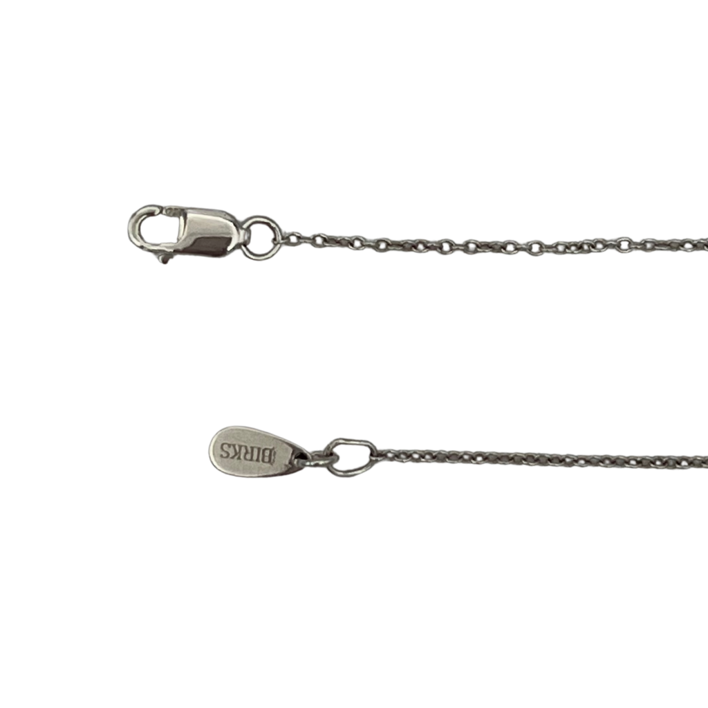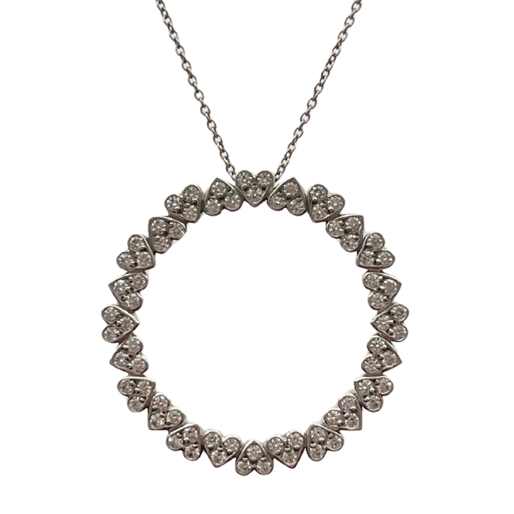 Vintage Birks circular pendant with bezel set diamonds (three in one setting) in an 18k white gold continuous heart motif on a white gold chain.