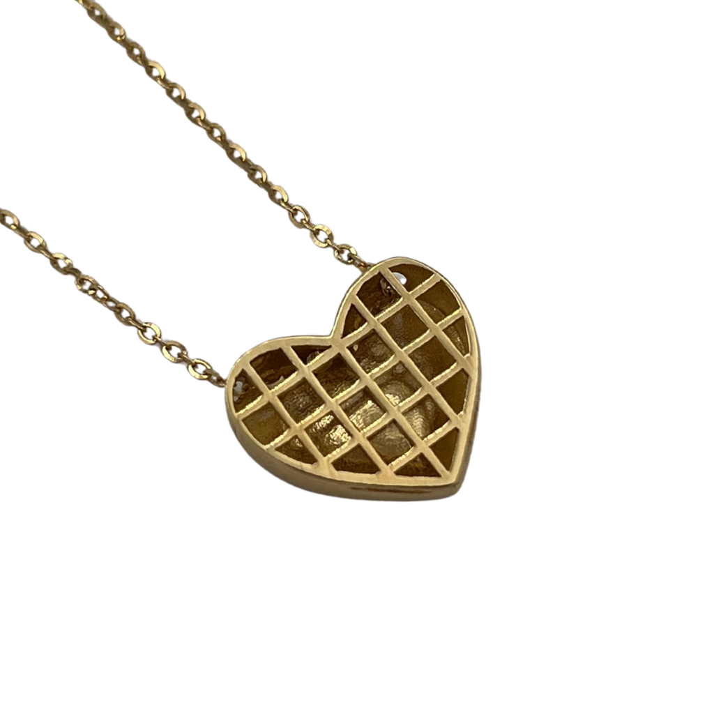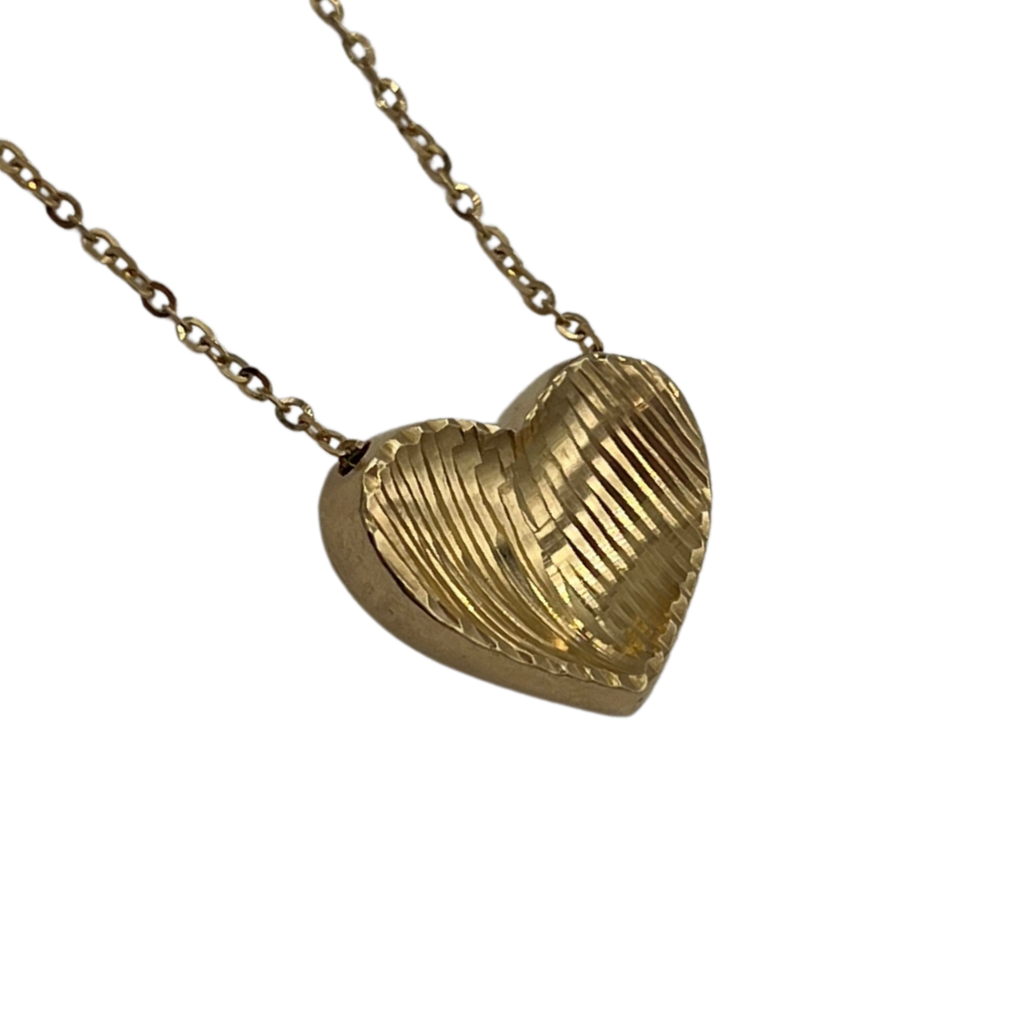 Adorable vintage sliding heart pendant with a concave brushed finish on one side, and waffle pattern on the other attached to a delicate 1mm oval link chain.
