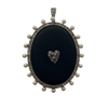 Rare and unique antique locket dating to the Victorian era (circa 1837-1901) with a matte black onyx exterior case framed by pavé-set rose cut diamonds around the border, on the heart ornament, and on the bail. Seed pearls run along the exterior edge of the locket.  This piece is among the "Daisy Exclusive" favourites!