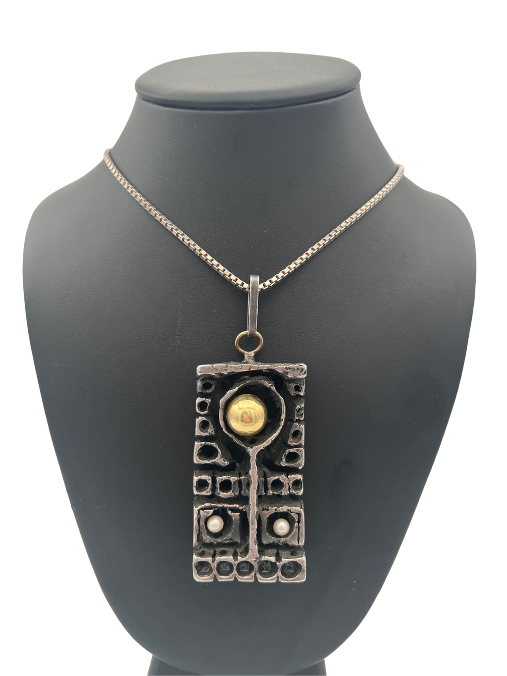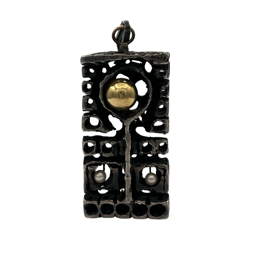 This signed Walter Schluep sterling silver pendant adorned with yellow gold and pearls is a wonderful example of Walter Schluep's ability to create wearable pieces of art.