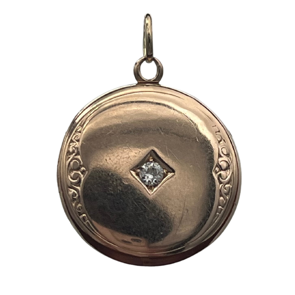 Absolutely precious antique Edwardian locket in 14k rose gold with a center diamond and engraved scroll detailing on the sides of the locket dating to the early 1900's.