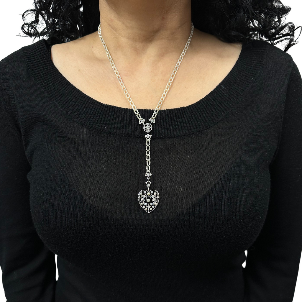 Stunning Edwardian natural seed pearl and diamond necklace with removable gallery set heart pendant C.1900. Necklace displays exceptional craftsmanship showing filigree, millegrain, and open work.