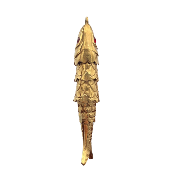 Delightful 18k yellow gold articulated fish pendant with bright red glass eyes.
