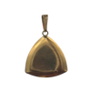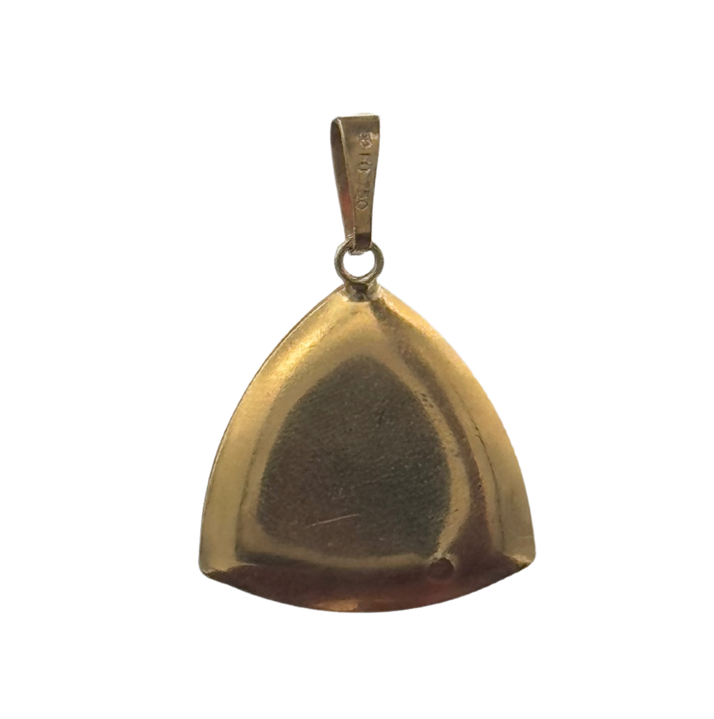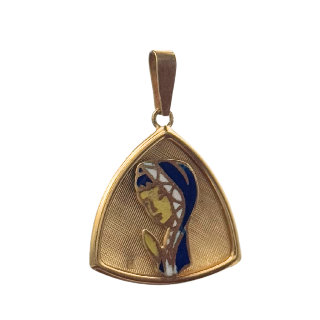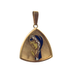 Vintage 18k yellow solid gold enamelled triangular framed Virgin Mary pendant, with a textured gold finish background and a high polish frame.