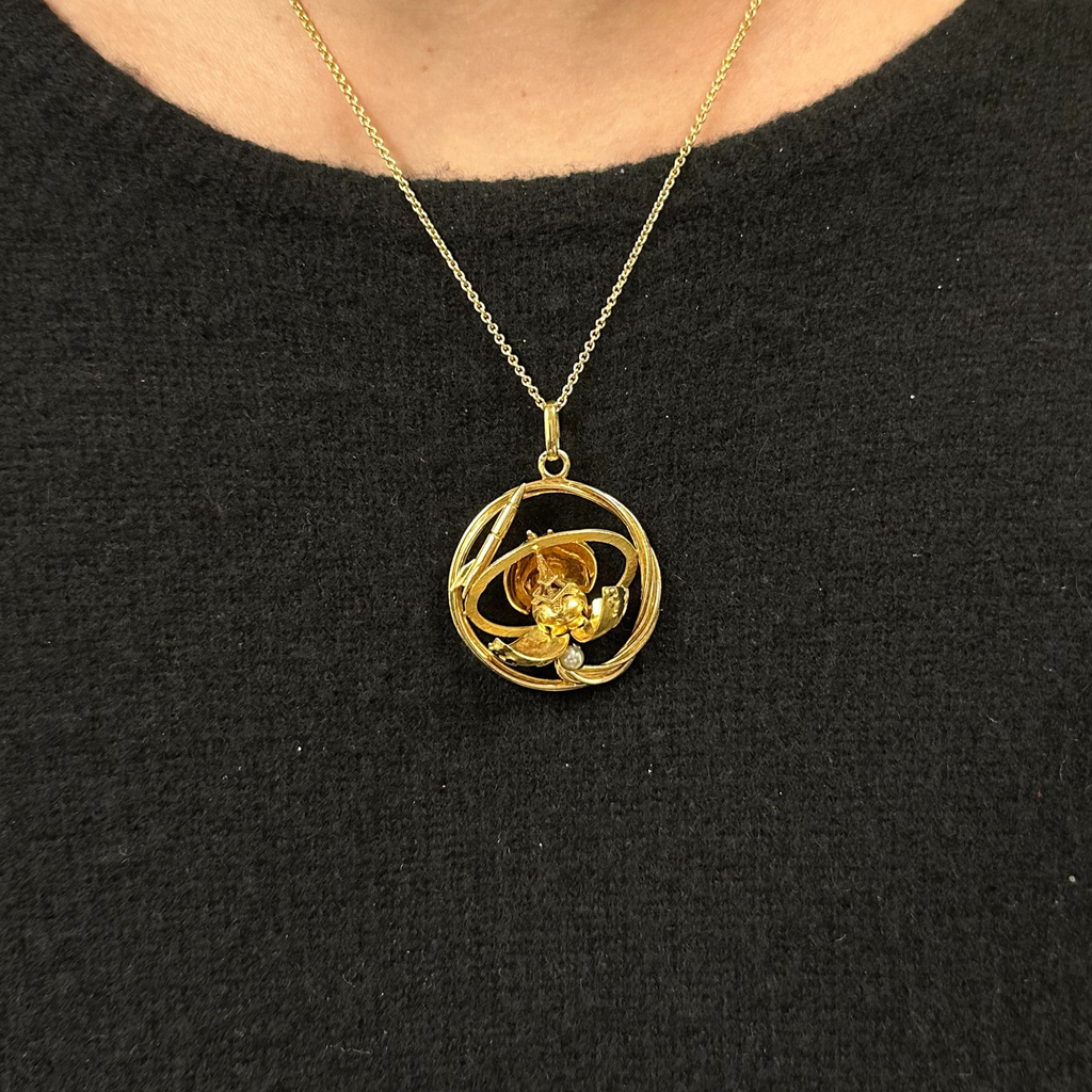 This vintage French charm pendant in 18 karat yellow gold has a globe inside the two rings that opens to reveal the Eiffel Tower.
