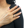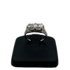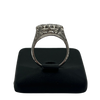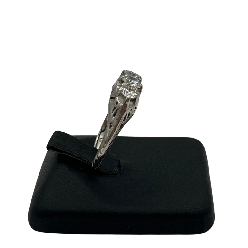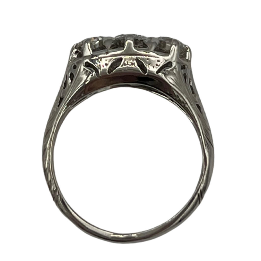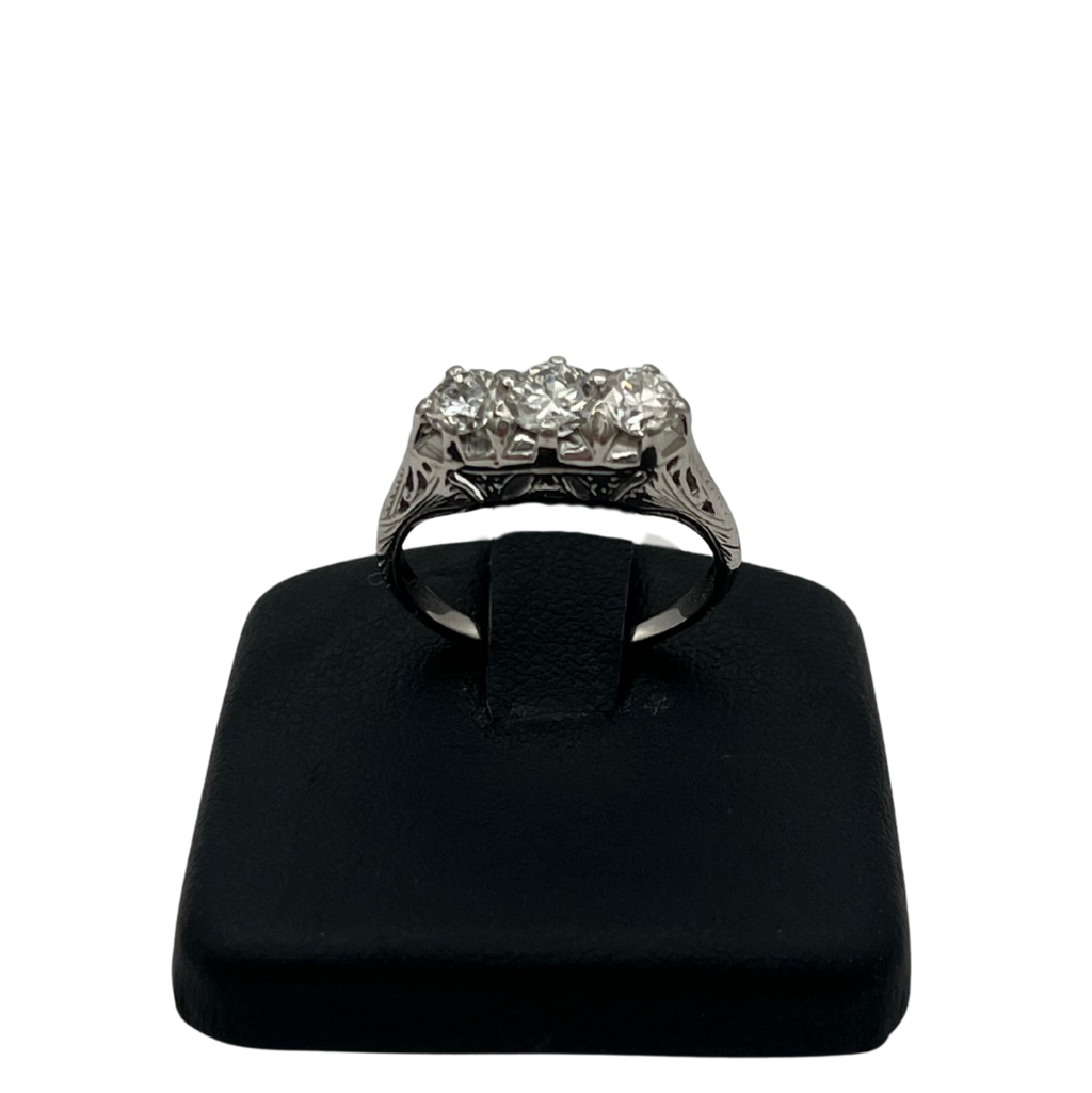 Diamonds: Three (3) prong set, transitional cut diamonds. The middle stone measures approximately 4.5mm x 2.56mm, est. 0.32ct,and the two (2) flanking stones measure approximately 4.3mm x 2.46-2.76mm, est. 0.28-0.30ct ea. The estimated colour is G/H and the estimated clarity is VVS2-VS1. The total estimated diamond weight is 0.90ct.