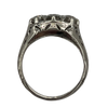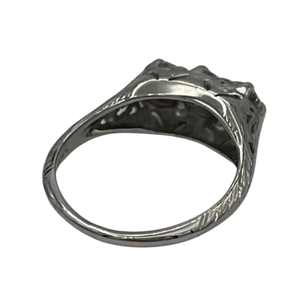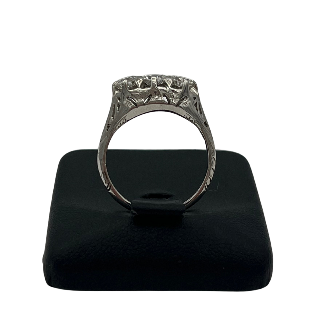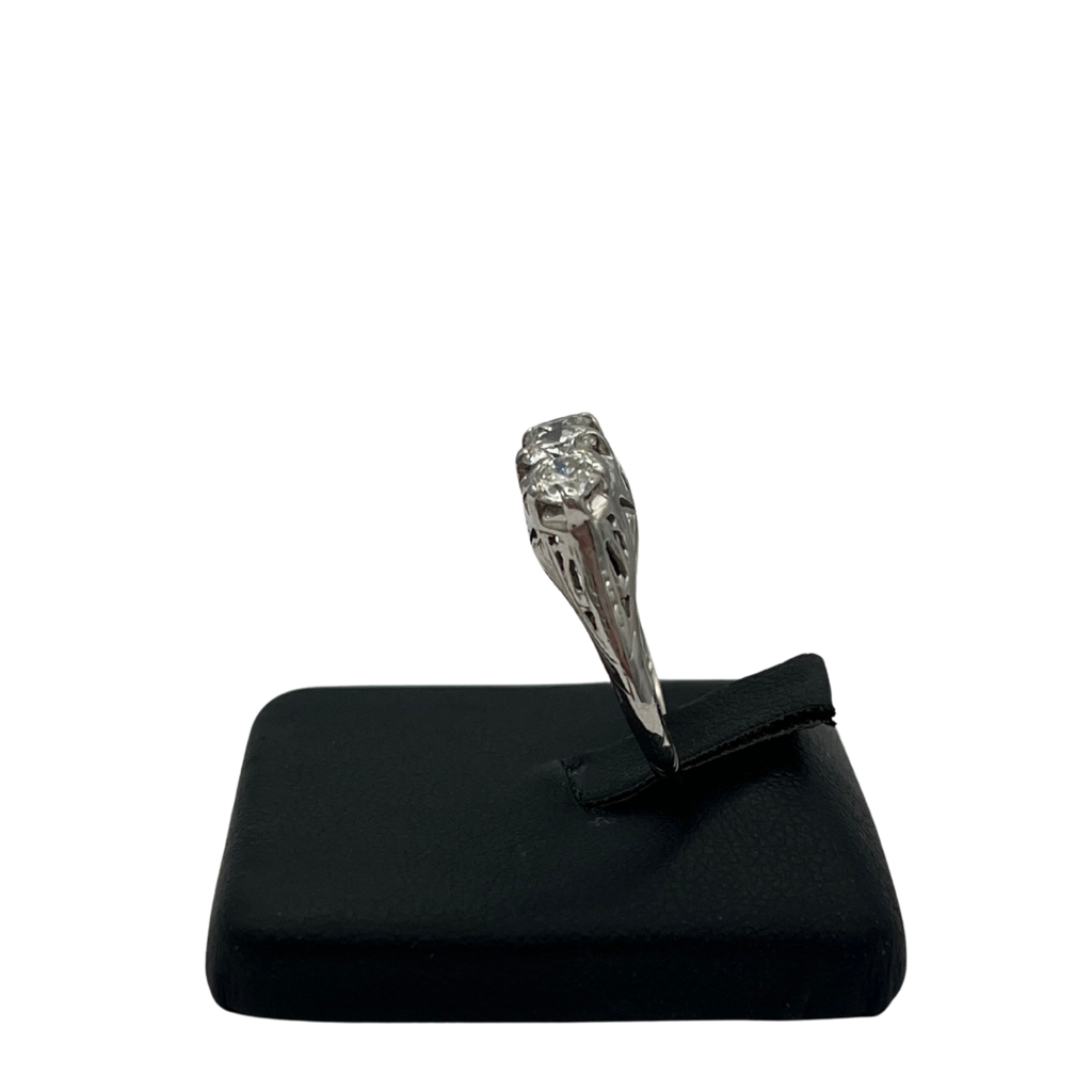 Stunning antique "Art Deco" circa 1920, three-stone diamond ring in 18k white gold with a high gallery decorated with millegrain and openwork.