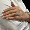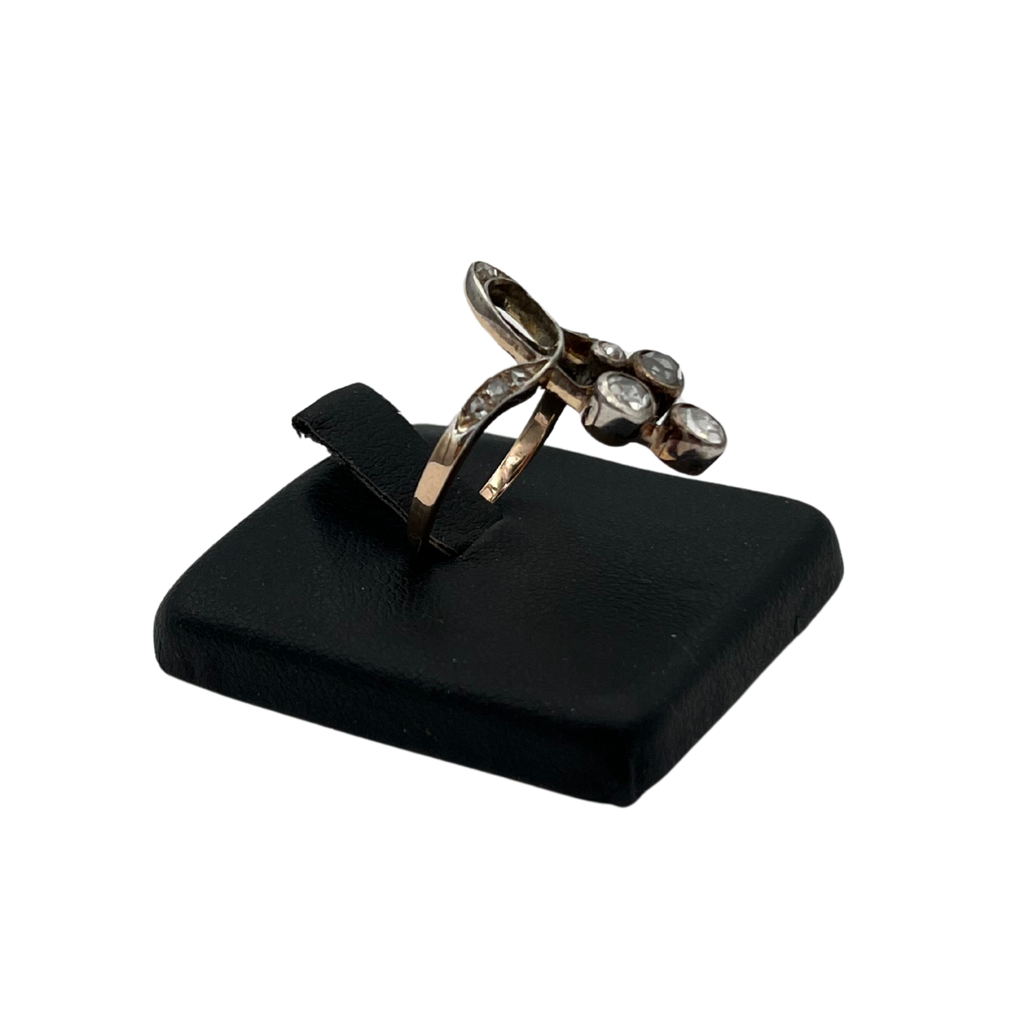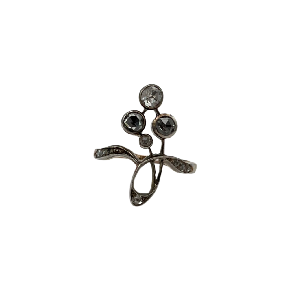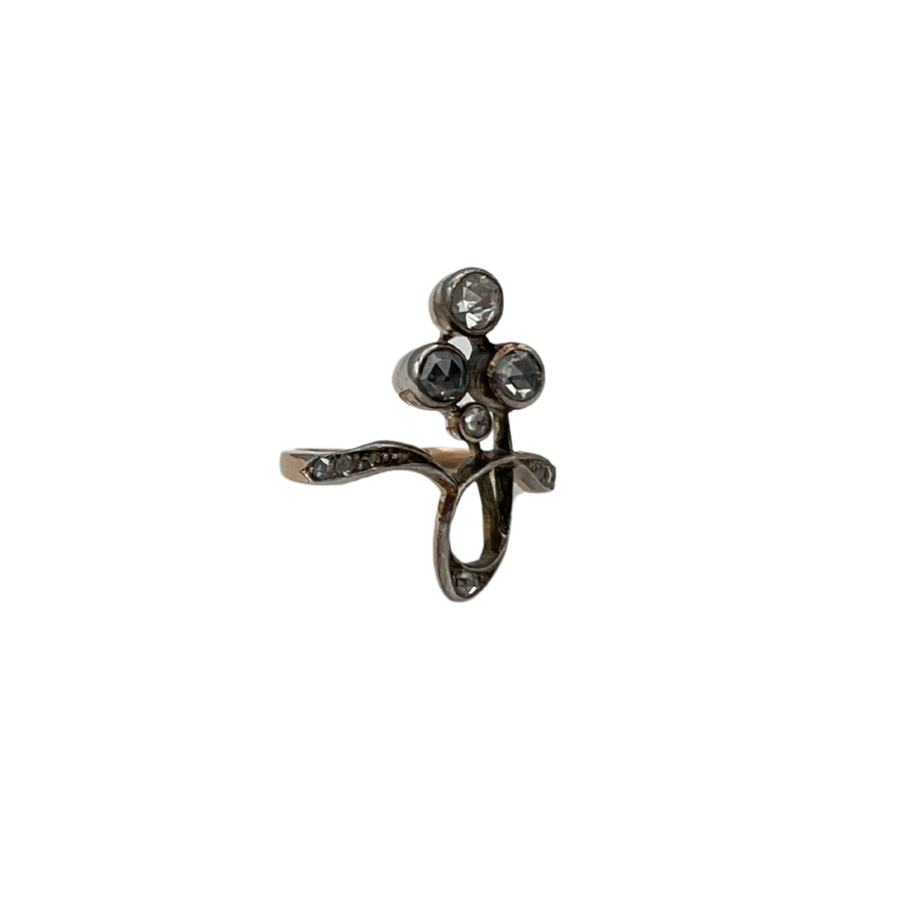 A unique antique ring featuring rose cut diamonds set in silver on 14k rose gold.