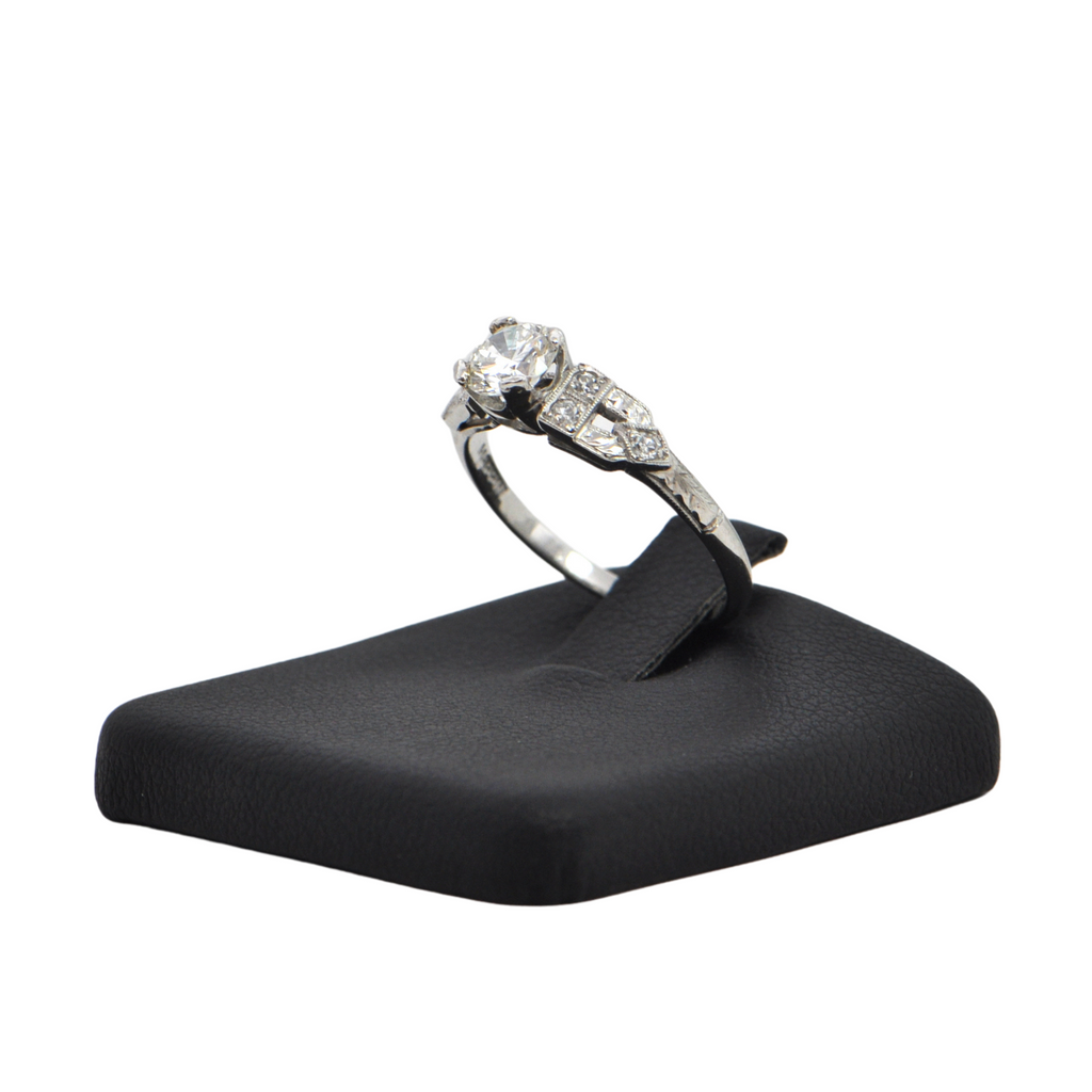Elegant and timeless Art Deco diamond ring handmade in gleaming platinum. Delicate millegrain work adorn the shoulders of the ring.