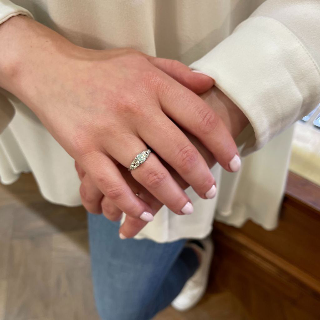 Secondary Diamonds: Six (6) pavé set, single cut diamonds measuring approximately 1.6mm each with a total estimated 0.09CT secondary diamond weight.