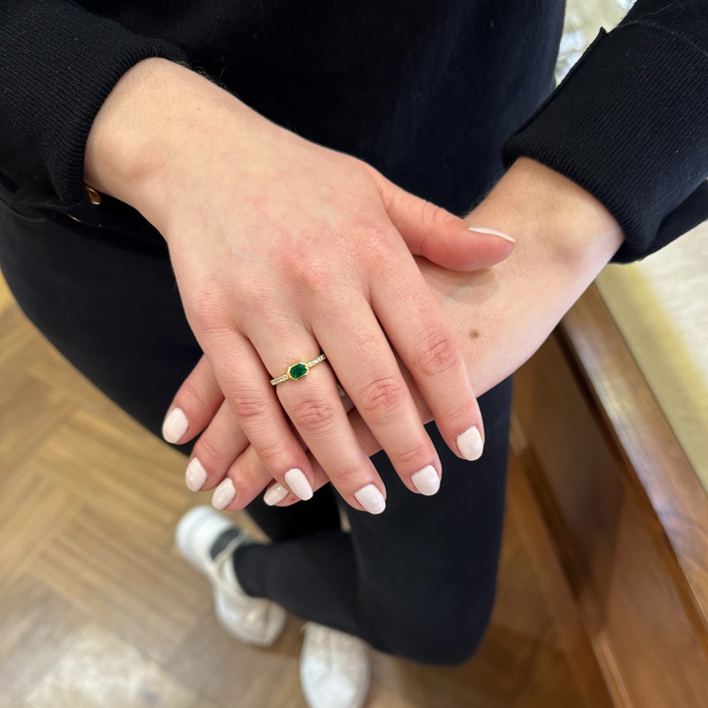 Delicate and dainty custom-made Daisy exclusive 22k yellow gold ring featuring a gorgeous vibrant green emerald with sparkling white diamonds.