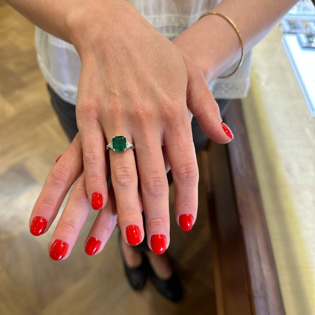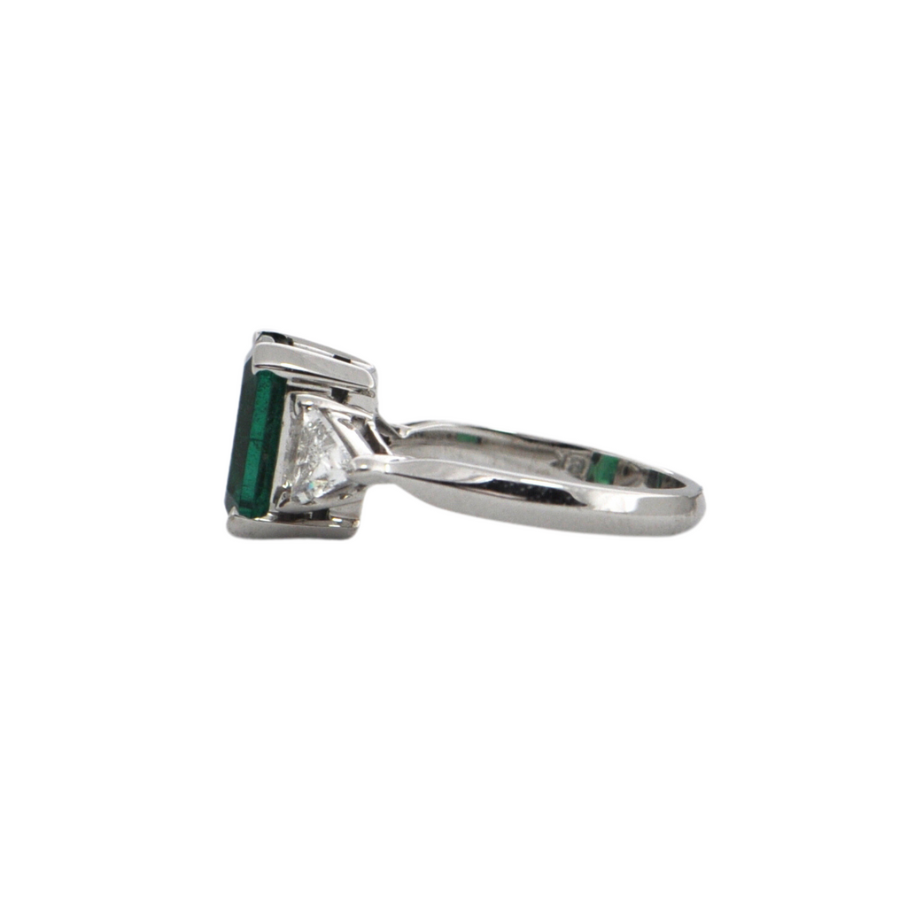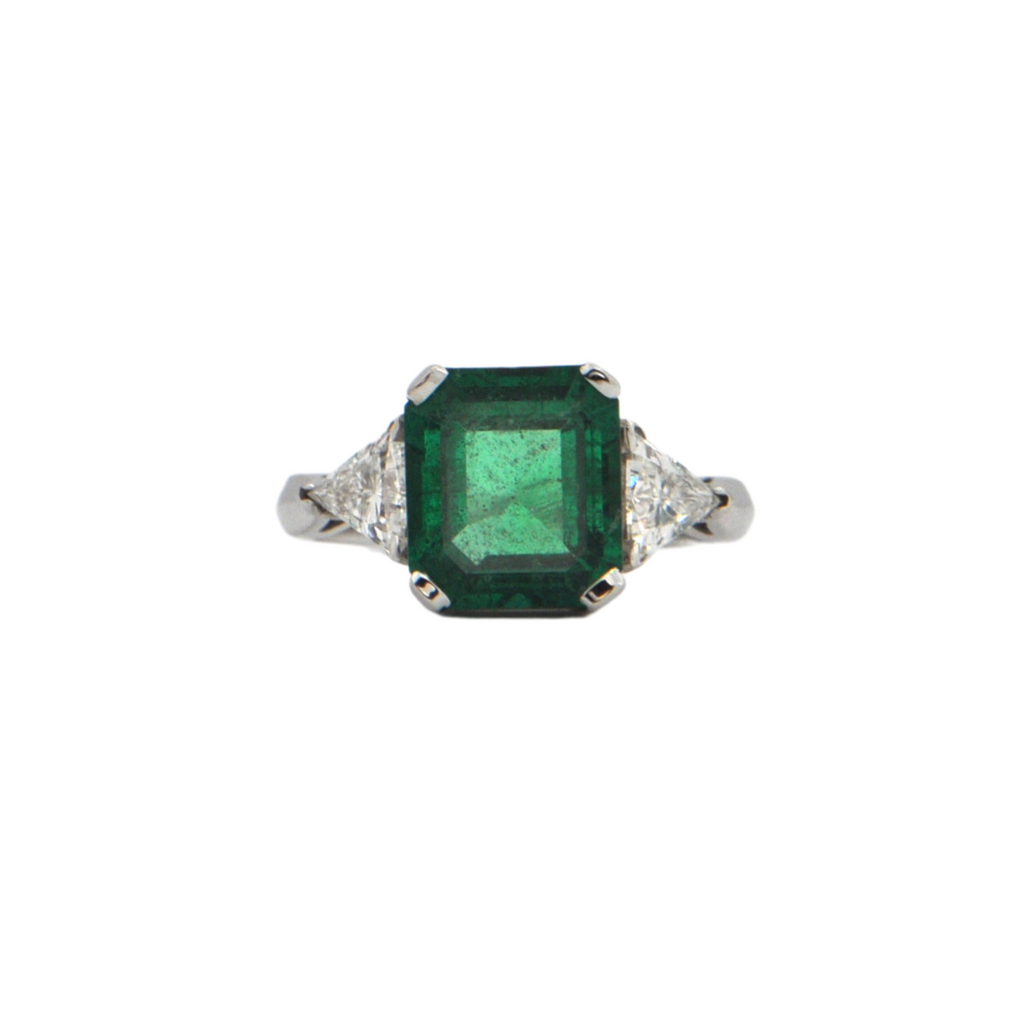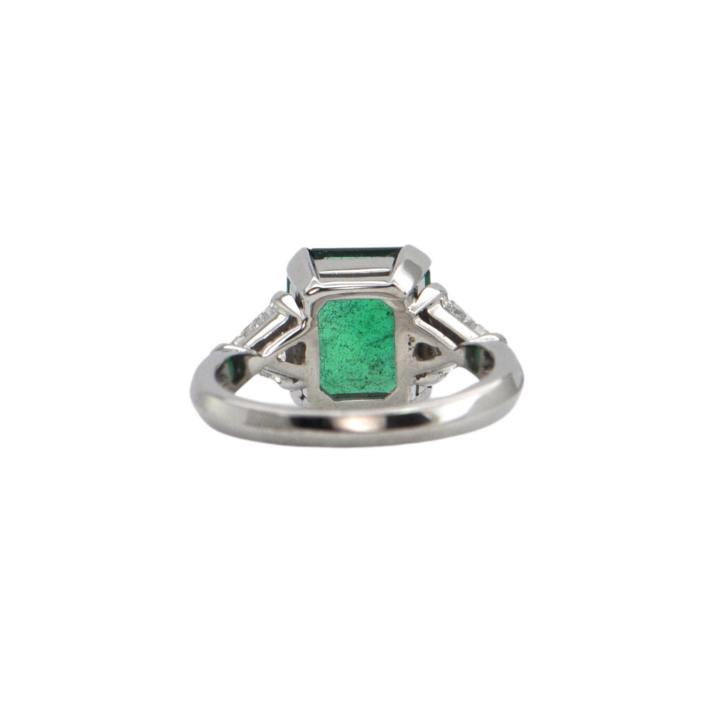 Emerald: One (1) prong set, rectangular cut emerald measuring approximately 9.44 x 8.43 x 5.24mm with an estimated weight of 2.61ct. Emerald shows deep intense green colour and is moderately included.