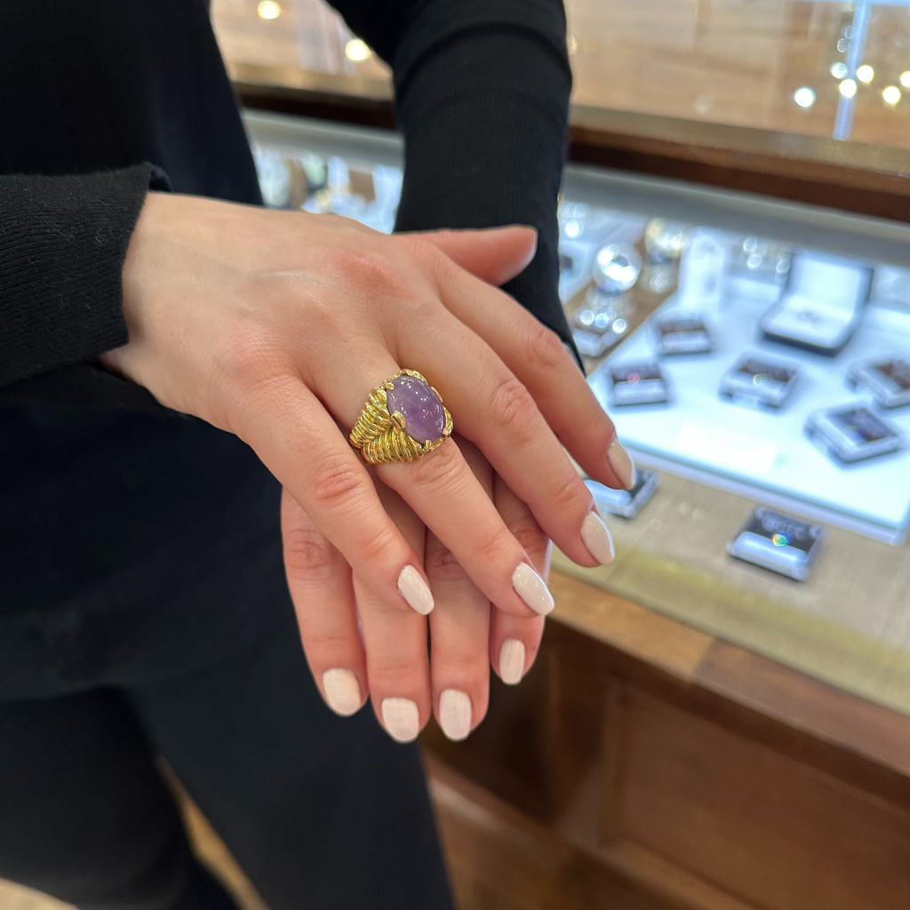 Amethyst: One (1) prong set, oval cabochon cut amethyst measuring approximately 17.39 x 12.86 mm with an estimated weight of 9.56CT.