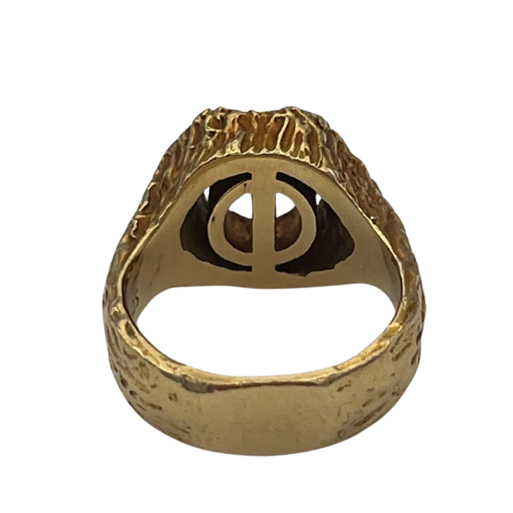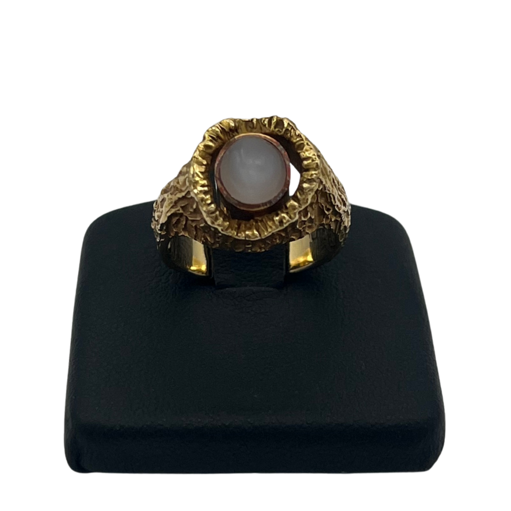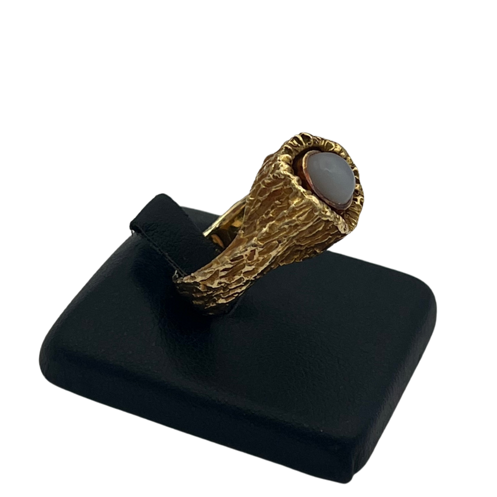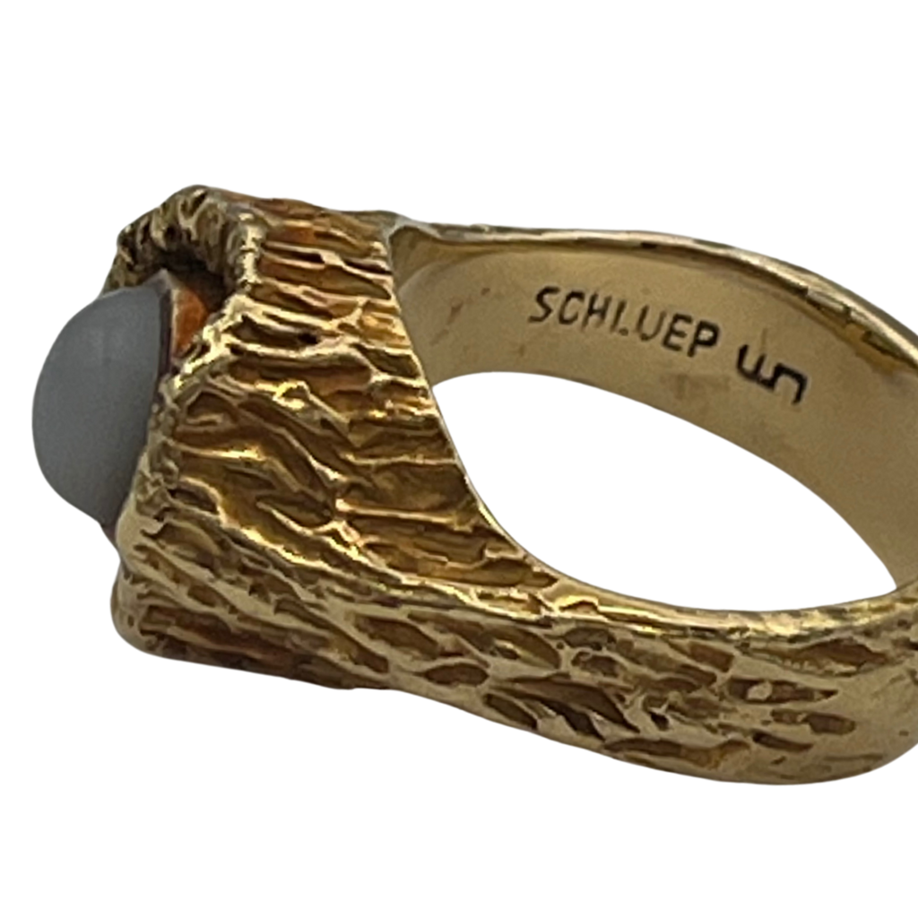 Estate signed Walter Schluep brutalist style Moonstone 18k yellow gold ring. This ring shows the true effect of a cat's eye chatoyancy sometimes seen in moonstone.