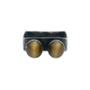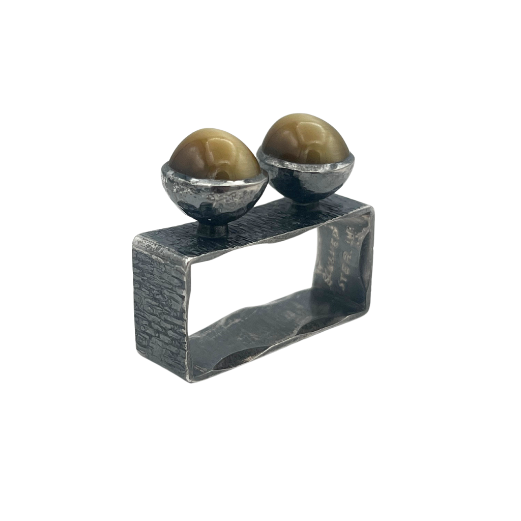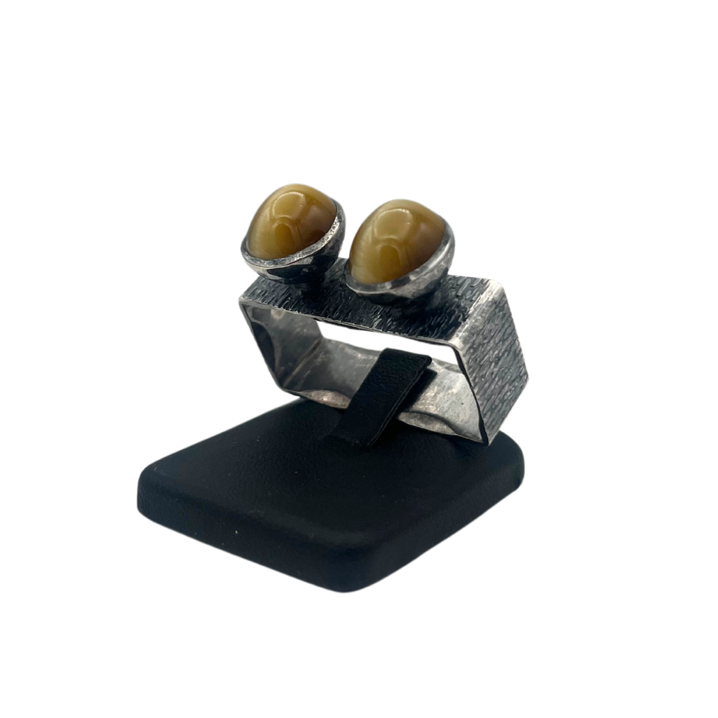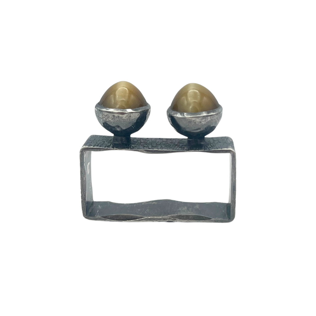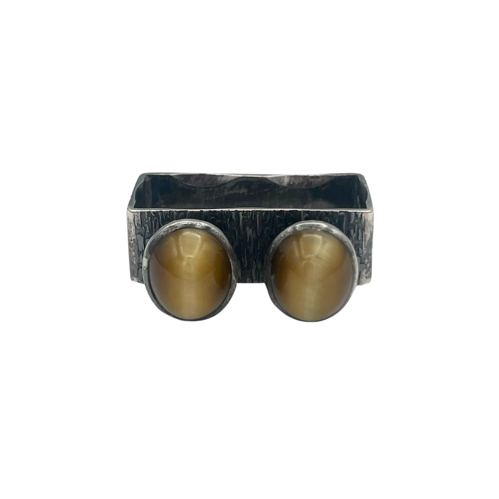 Estate signed Walter Schluep Sterling Double Cats Eye Quartz Two Finger ring. Beautifully hand hammered and oxidized, this statement ring is anything but ordinary.