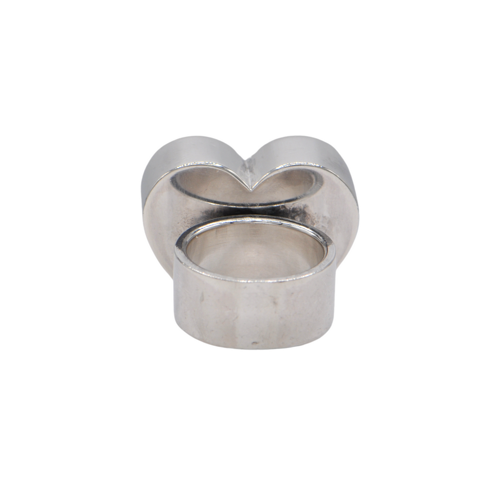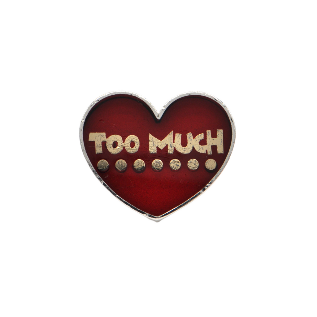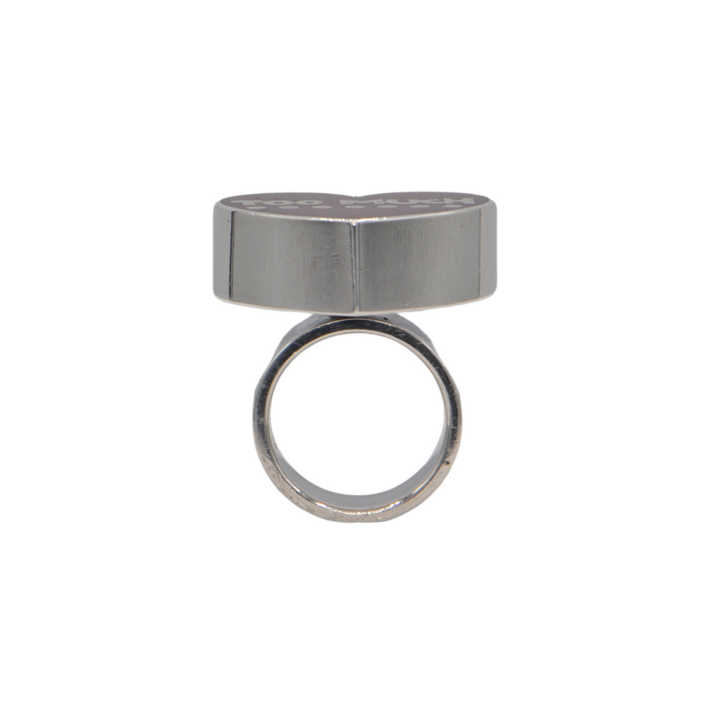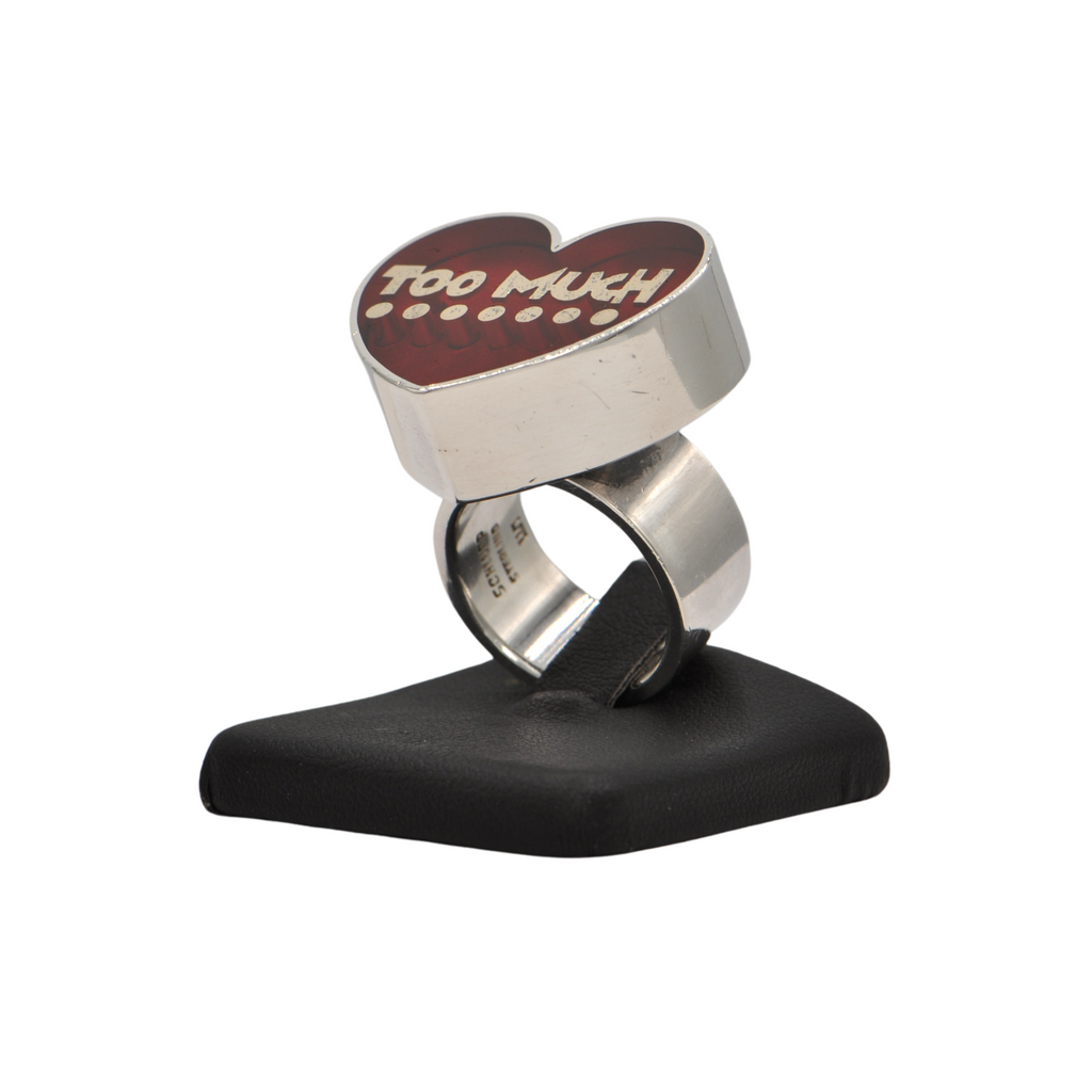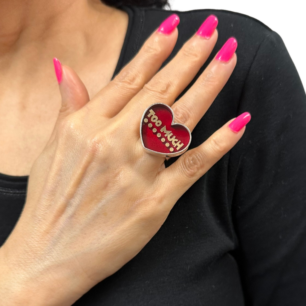 Estate signed Walter Schluep red resin "TOO MUCH" heart sterling silver ring.