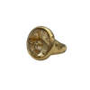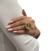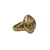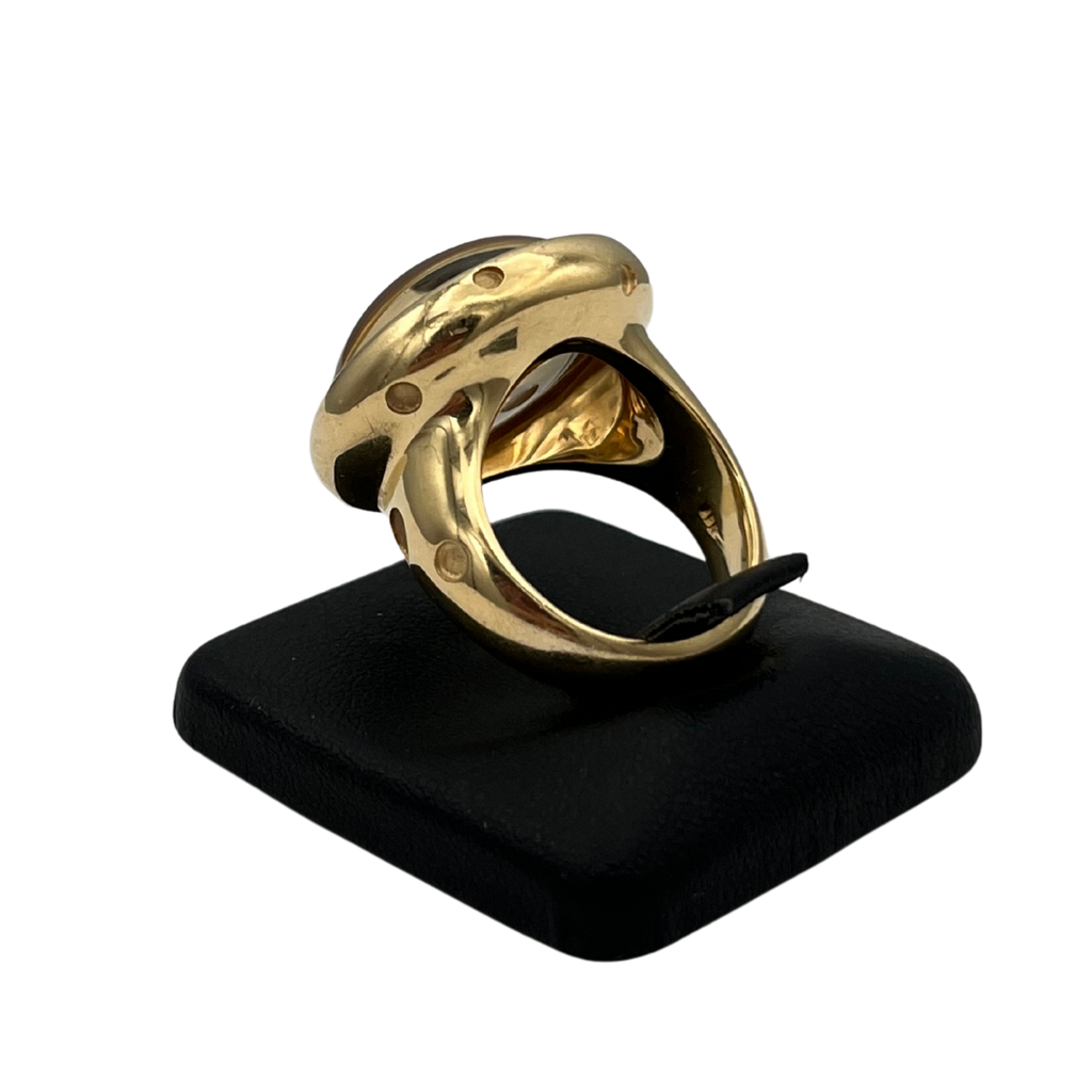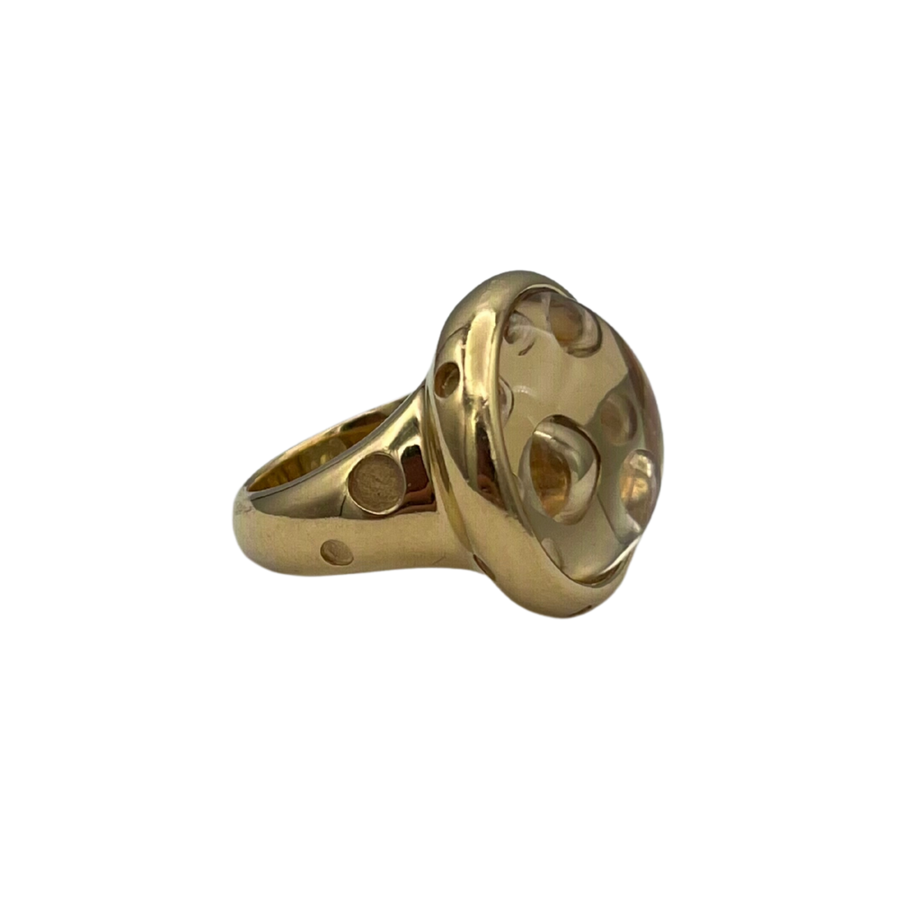 A beautiful light yellow cabochon cut citrine hand carved from the back to give the appearance of bubbles in the stone. Further, the ring is designed with additional crevices in the band to add to the design.