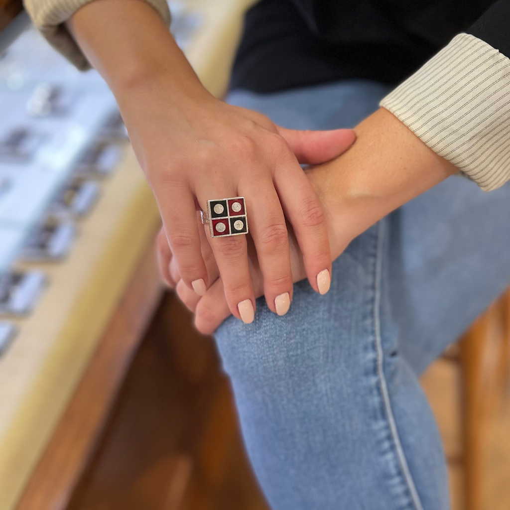 Signed Walter Schluep modernist style textured sterling ring with an alternating black and red resin checkerboard pattern square top.