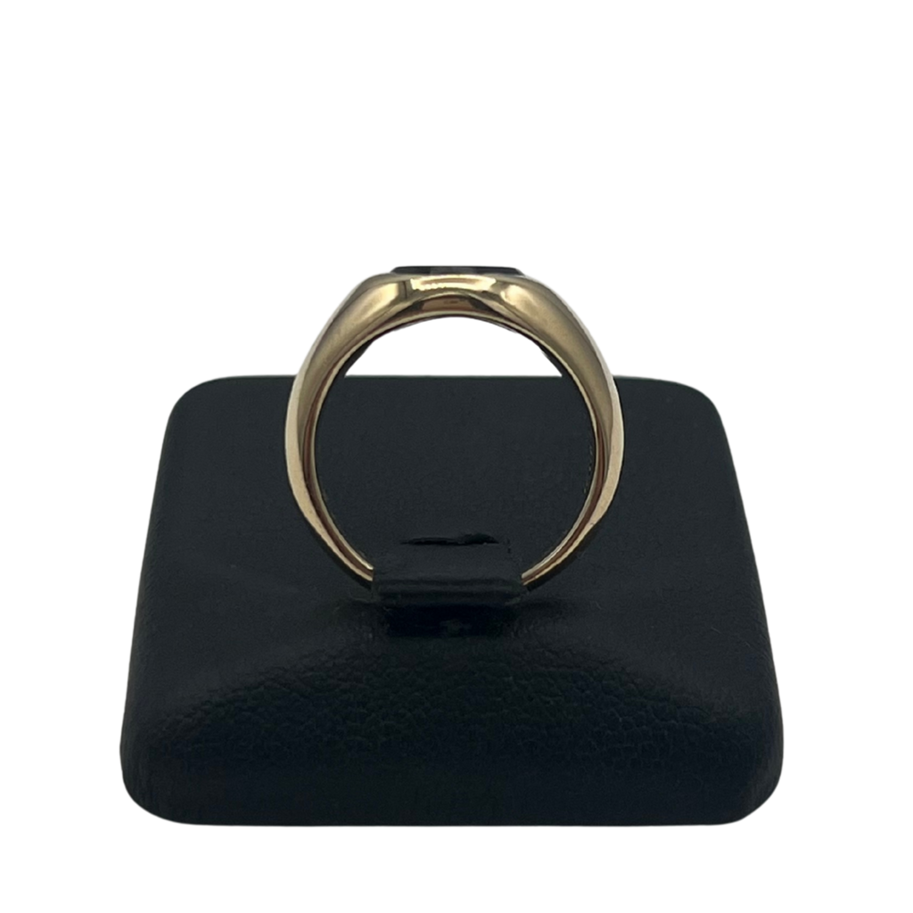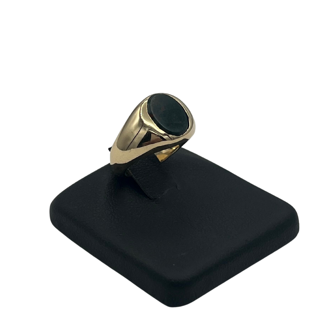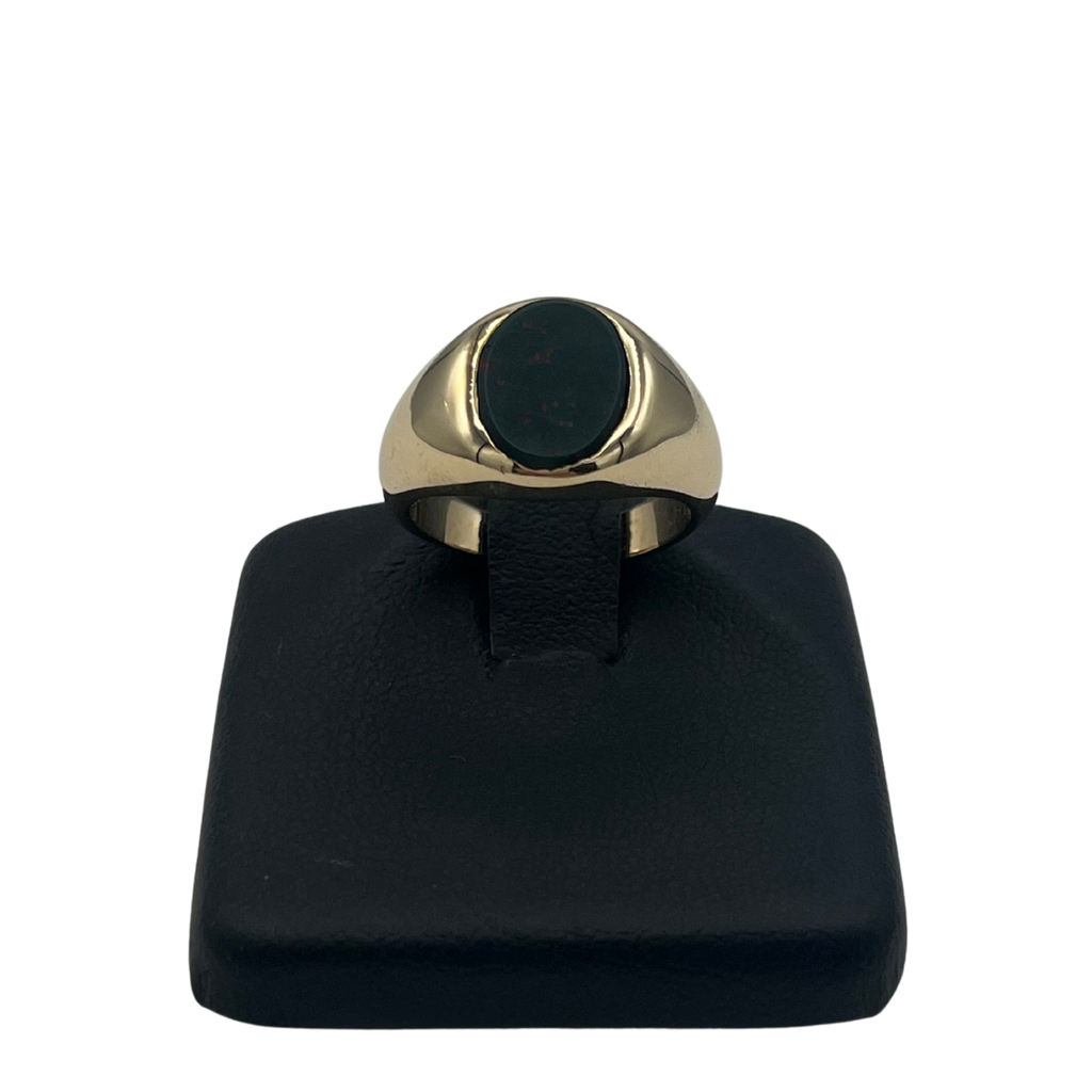 Vintage high polish 10k yellow gold signet ring featuring a flat oval polished bloodstone.