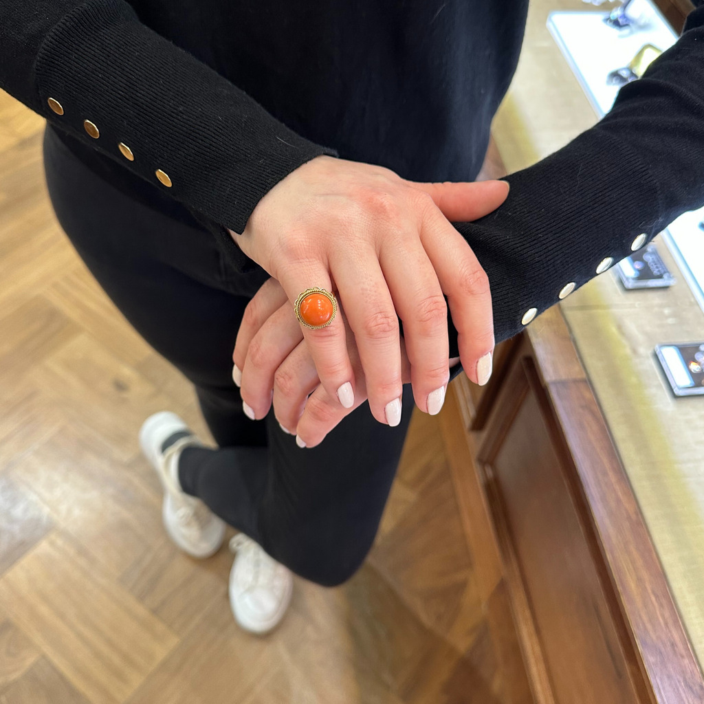 Large glossy salmon colored round cabochon cut coral set in 14k yellow gold featuring a twisted gold and scalloped edge setting.