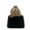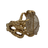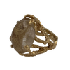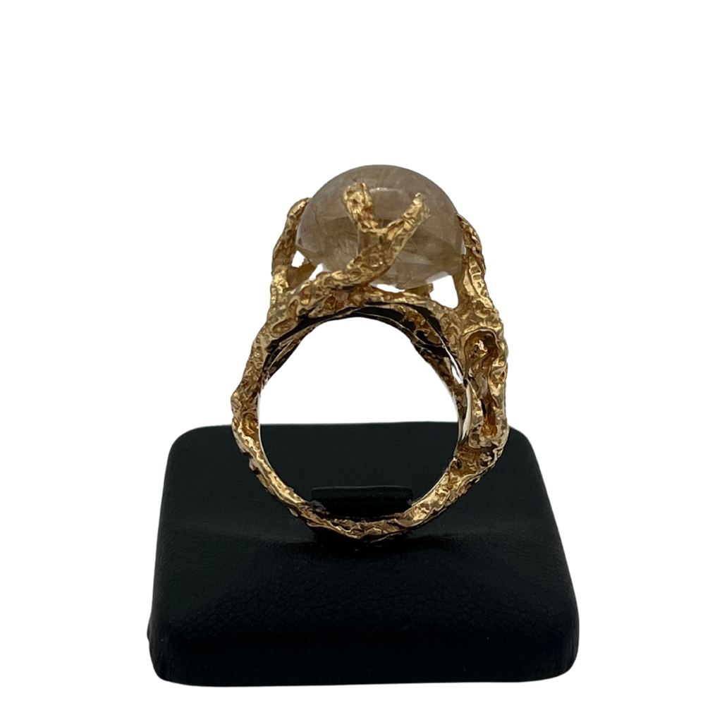 Vintage rutilated quartz cabochon set in an abstract, textured 14k yellow gold ring. This variety of quartz, also known as 'Venus' Hair Stone', is valued for it's golden needle-like inclusions visible in the stone.