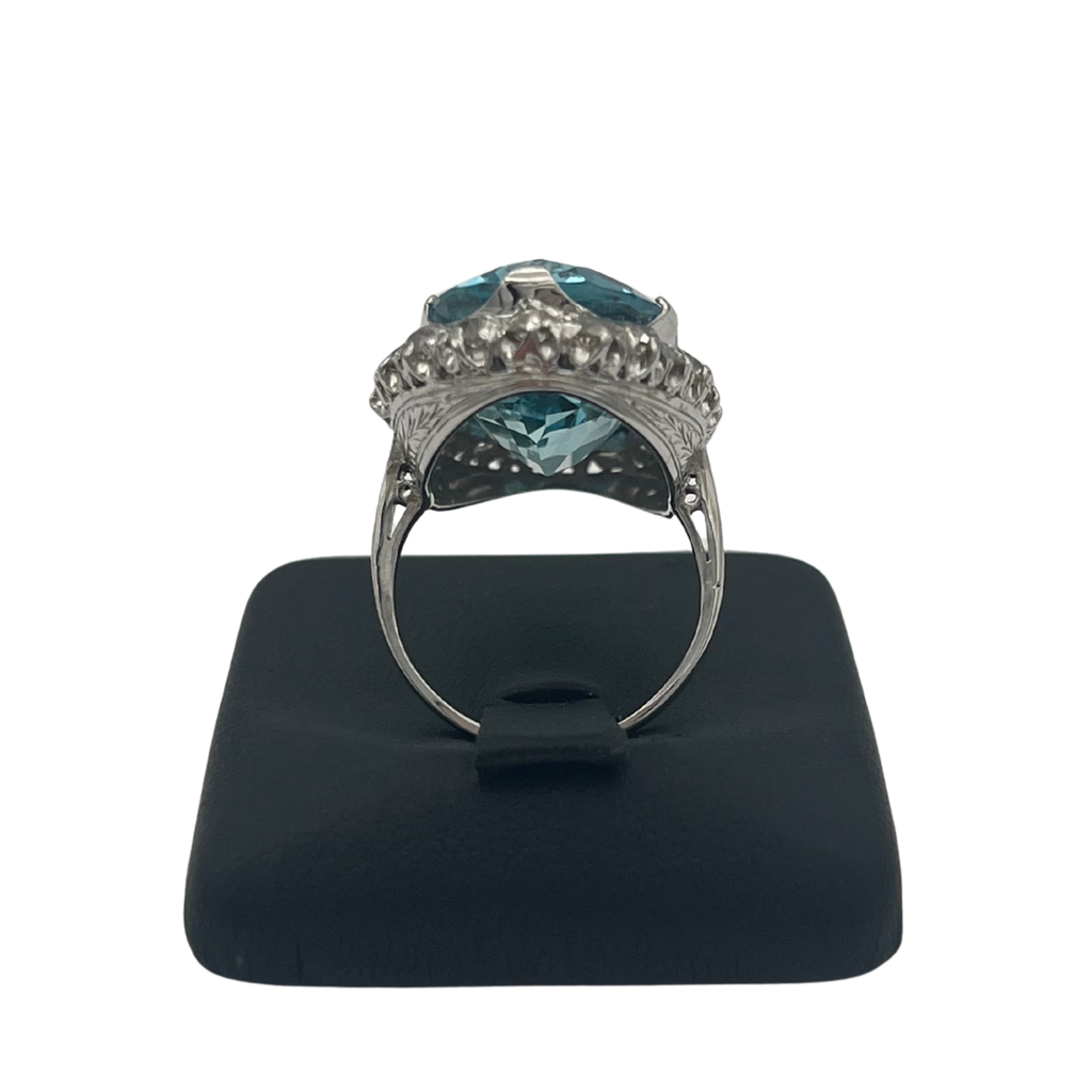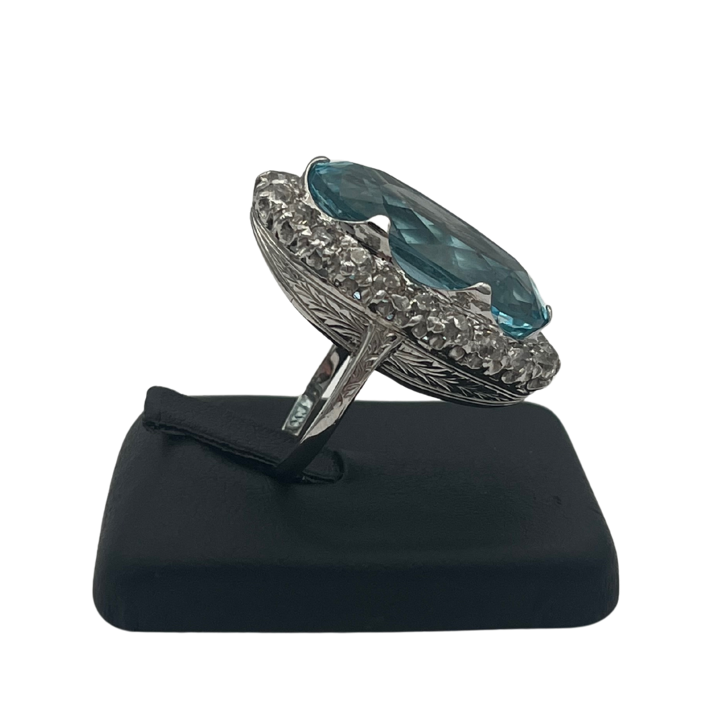 Elegant antique Edwardian (C. 1900's) 18.34ct aquamarine with diamond halo 18k white gold ring. Shank is beautifully engraved with a foliate style motif.