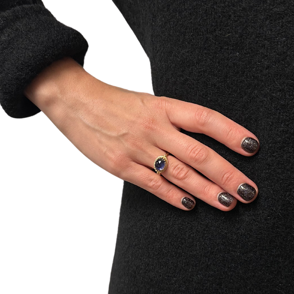 Vintage iolite and filigree engraved 14k yellow gold ring by American jewelry designer Becky Kelso.