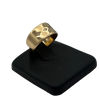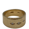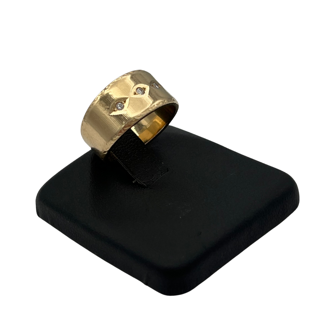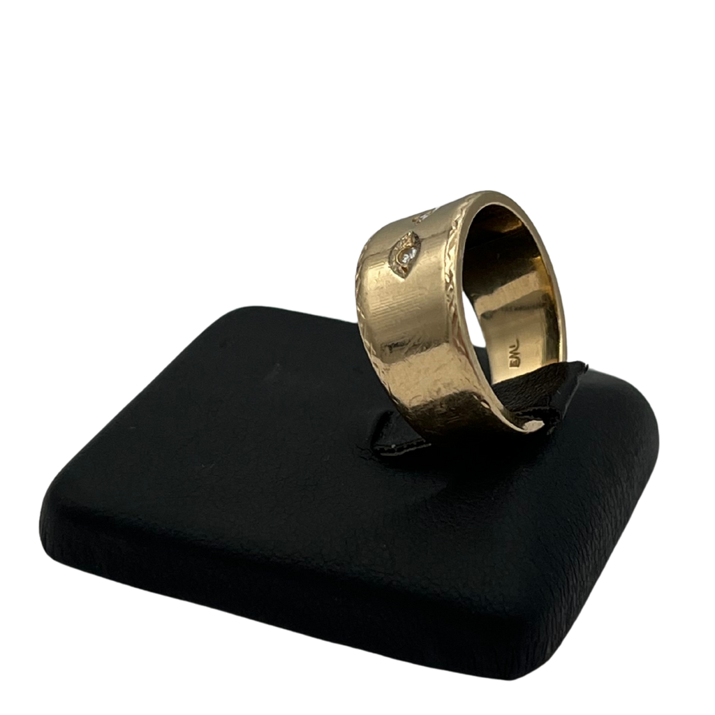 Designed to resemble the band on a cigar, the cigar band ring style has seen a jump in popularity recently. This lovely vintage solid 14k yellow gold ring features a satin (or brush) finish with an etched border and is adorned with three pre-set diamonds.