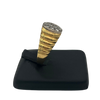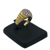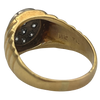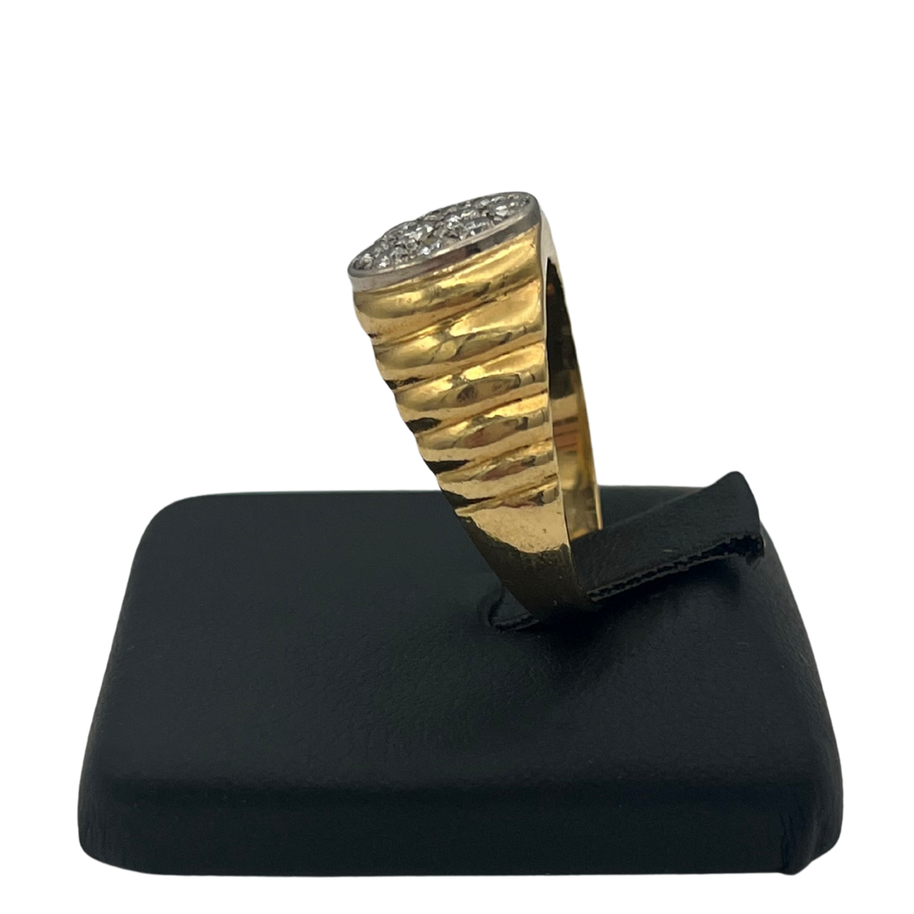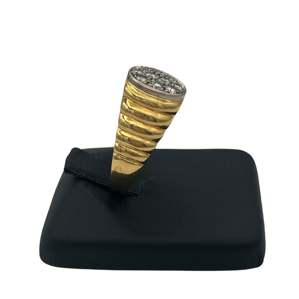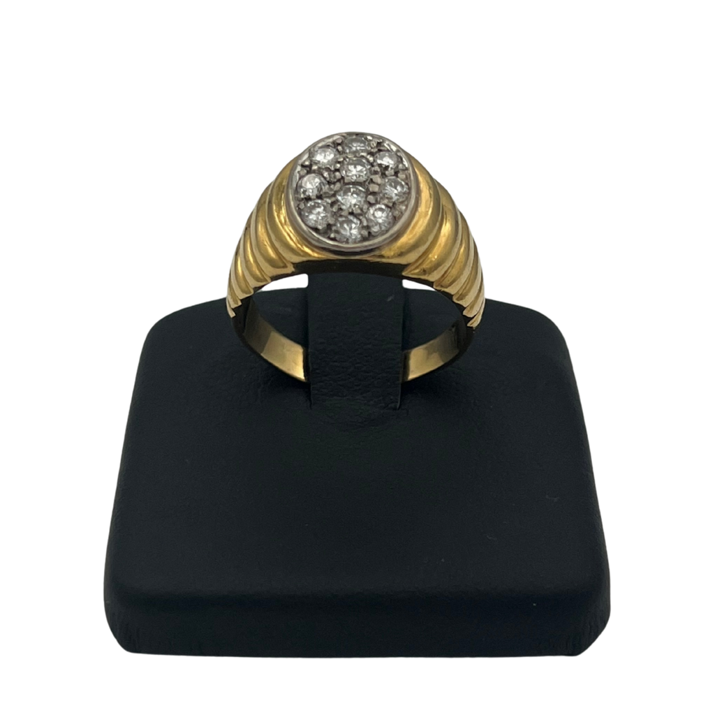 Vintage 18k yellow gold ring with an oval cluster of diamonds set in white gold, with a ridged texture along the band.